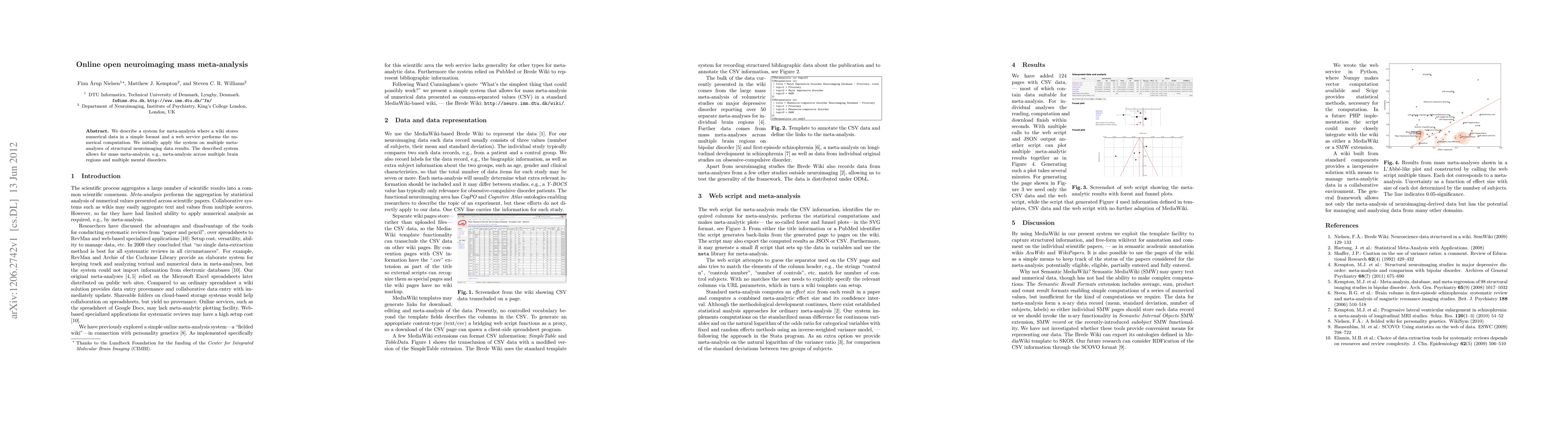 This paper introduces a web-based system for conducting large-scale meta-analyses in neuroimaging, utilizing a wiki for data storage and a web service for computations. It demonstrates the system's application in analyzing structural neuroimaging data across various brain regions and mental disorders.
