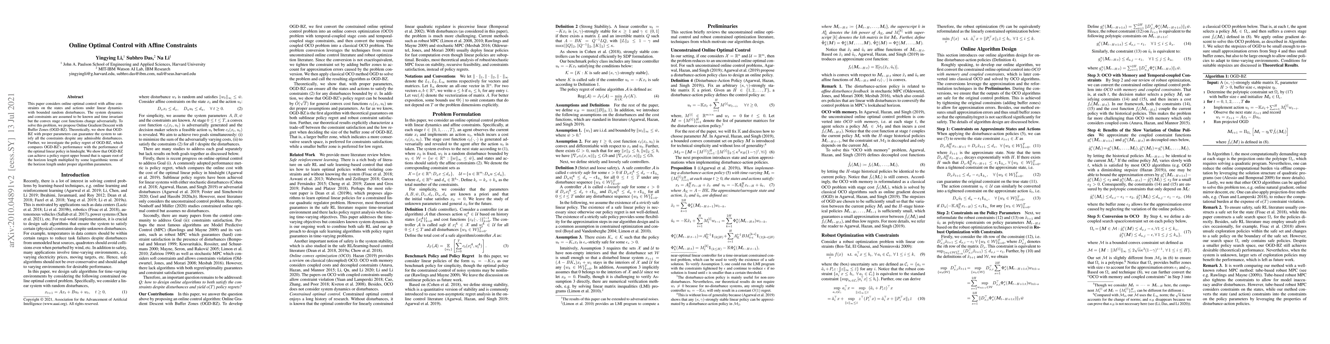 Researchers propose a new method called Online Gradient Descent with Buffer Zones to optimize control in systems with affine constraints and changing convex cost functions. It achieves a policy regret upper bound that is related to the horizon length of the system.