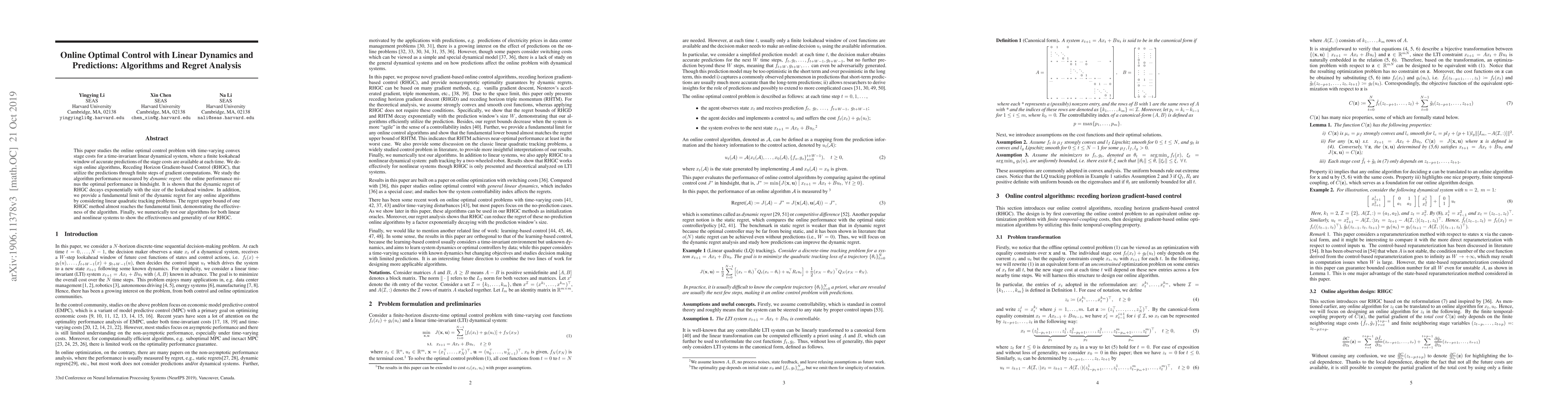 This paper proposes Receding Horizon Gradient-based Control (RHGC) algorithms for online optimal control of linear dynamical systems with time-varying convex stage costs, showing that their dynamic regret decays exponentially with prediction lookahead. The study also establishes a fundamental regret limit for linear quadratic tracking problems, demonstrating RHGC's near-optimal performance.
