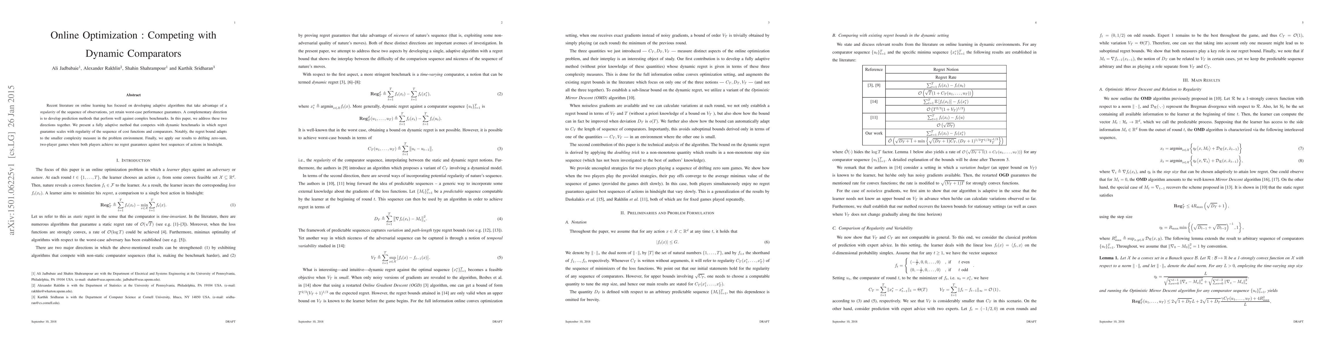 Recent literature on online learning has focused on developing adaptive algorithms that take advantage of a regularity of the sequence of observations, yet retain worst-case performance guarantees. A complementary direction is to develop prediction methods that perform well against complex benchmarks. In this paper, we address these two directions together. We present a fully adaptive method that competes with dynamic benchmarks in which regret guarantee scales with regularity of the sequence of cost functions and comparators. Notably, the regret bound adapts to the smaller complexity measure in the problem environment. Finally, we apply our results to drifting zero-sum, two-player games where both players achieve no regret guarantees against best sequences of actions in hindsight.