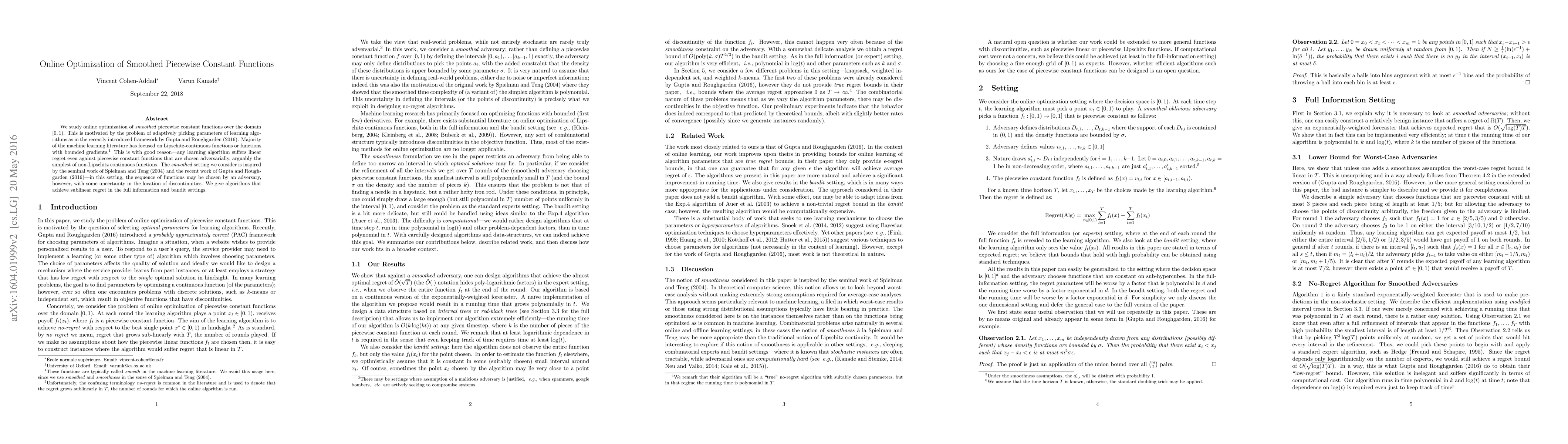 This paper investigates online optimization for smoothed piecewise constant functions over [0, 1), motivated by adaptive parameter selection in learning algorithms. It presents algorithms achieving sublinear regret in both full information and bandit settings, contrasting with the linear regret typically seen for non-smooth functions.