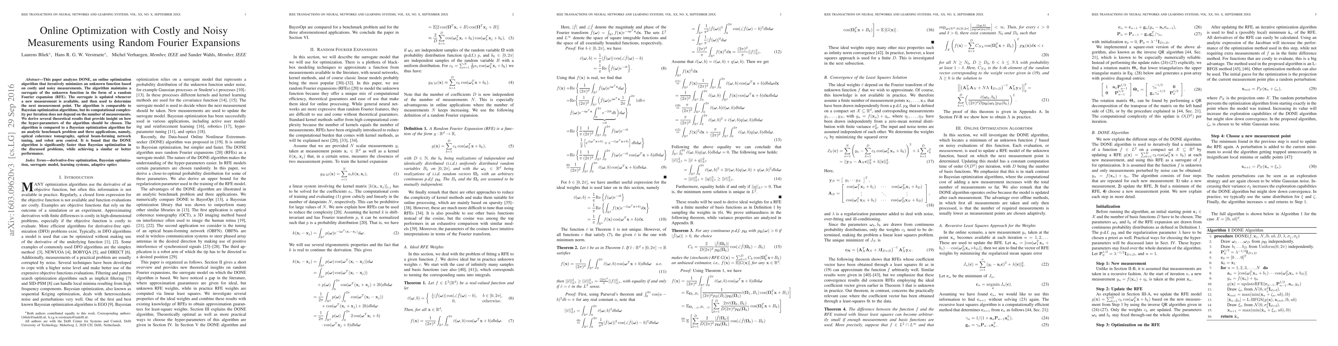 This paper analyzes DONE, an online optimization algorithm that iteratively minimizes an unknown function based on costly and noisy measurements. The algorithm maintains a surrogate of the unknown function in the form of a random Fourier expansion (RFE). The surrogate is updated whenever a new measurement is available, and then used to determine the next measurement point. The algorithm is comparable to Bayesian optimization algorithms, but its computational complexity per iteration does not depend on the number of measurements. We derive several theoretical results that provide insight on how the hyper-parameters of the algorithm should be chosen. The algorithm is compared to a Bayesian optimization algorithm for a benchmark problem and three applications, namely, optical coherence tomography, optical beam-forming network tuning, and robot arm control. It is found that the DONE algorithm is significantly faster than Bayesian optimization in the discussed problems, while achieving a similar or better performance.