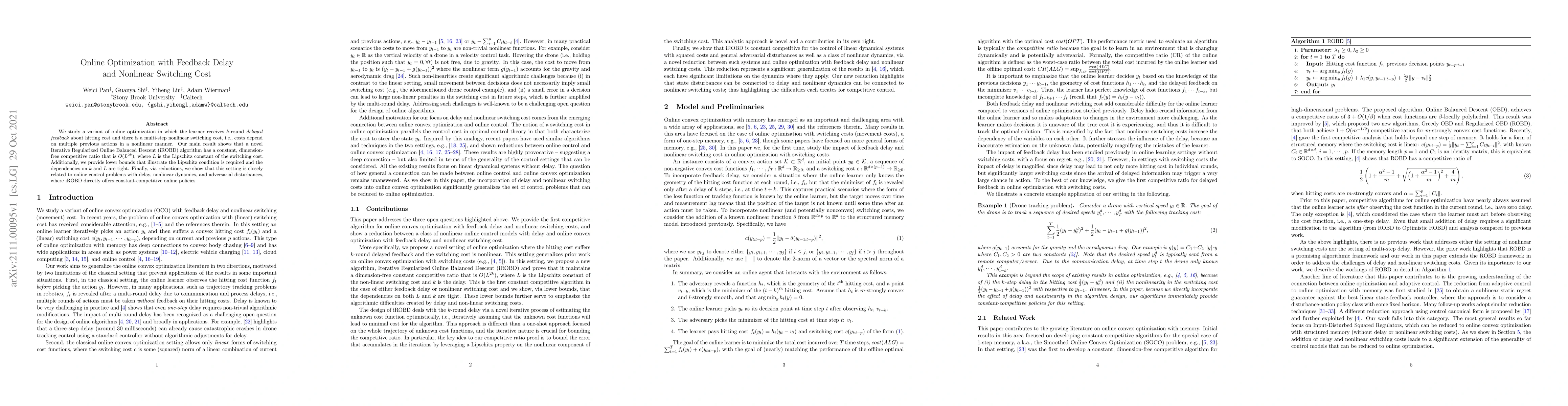 This paper explores online optimization under delayed feedback and nonlinear switching costs, introducing an Iterative Regularized Online Balanced Descent (iROBD) algorithm that achieves a constant competitive ratio of $O(L^{2k})$. The authors demonstrate the necessity of the Lipschitz condition and establish the tightness of their results through lower bounds.