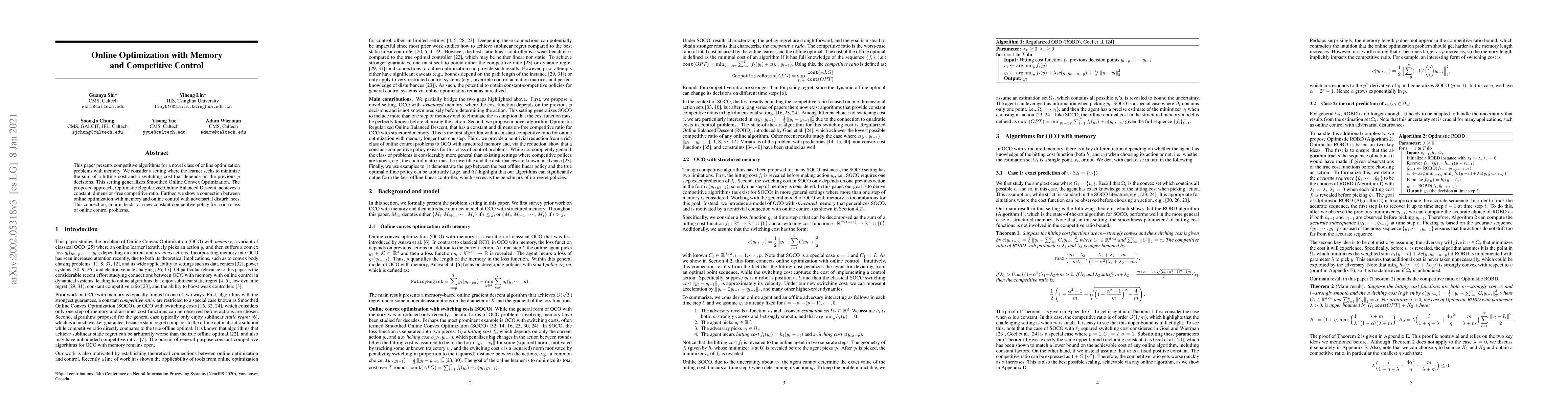 This paper introduces competitive algorithms for online optimization with memory, achieving a constant, dimension-free competitive ratio through the Optimistic Regularized Online Balanced Descent method. It also establishes a link between online optimization and control with adversarial disturbances, resulting in a new constant-competitive policy for a broad class of control problems.