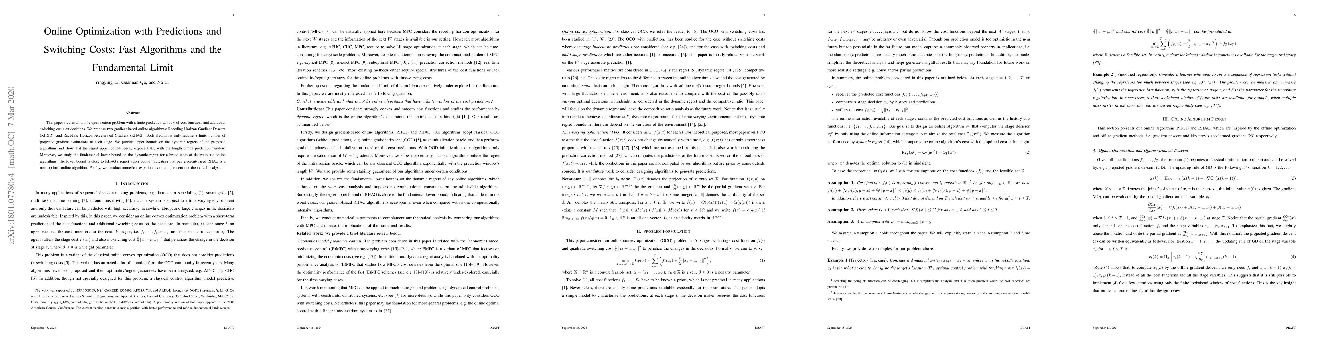 This paper proposes two gradient-based online algorithms, RHGD and RHAG, for optimizing under cost function predictions and switching costs, demonstrating their exponential regret decay. It also establishes a fundamental lower bound on dynamic regret, showing RHAG's near-optimality.