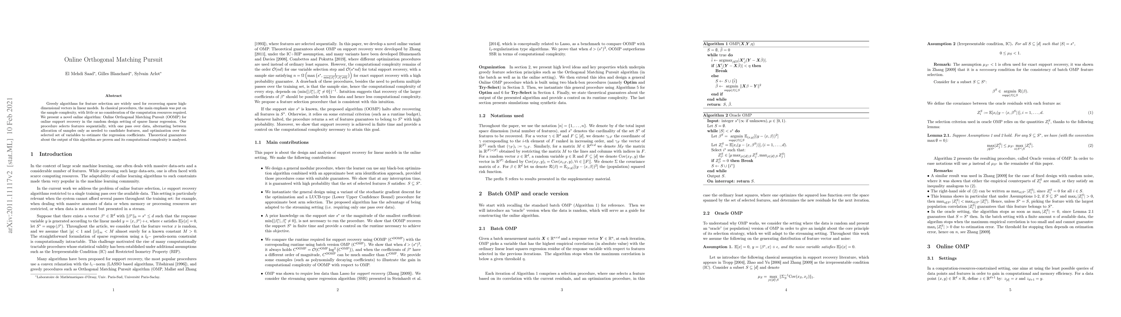The paper introduces Online Orthogonal Matching Pursuit (OOMP), a novel online algorithm for sparse high-dimensional vector recovery in linear regression, focusing on both sample complexity and computational efficiency. Theoretical guarantees and computational complexity analysis are provided.