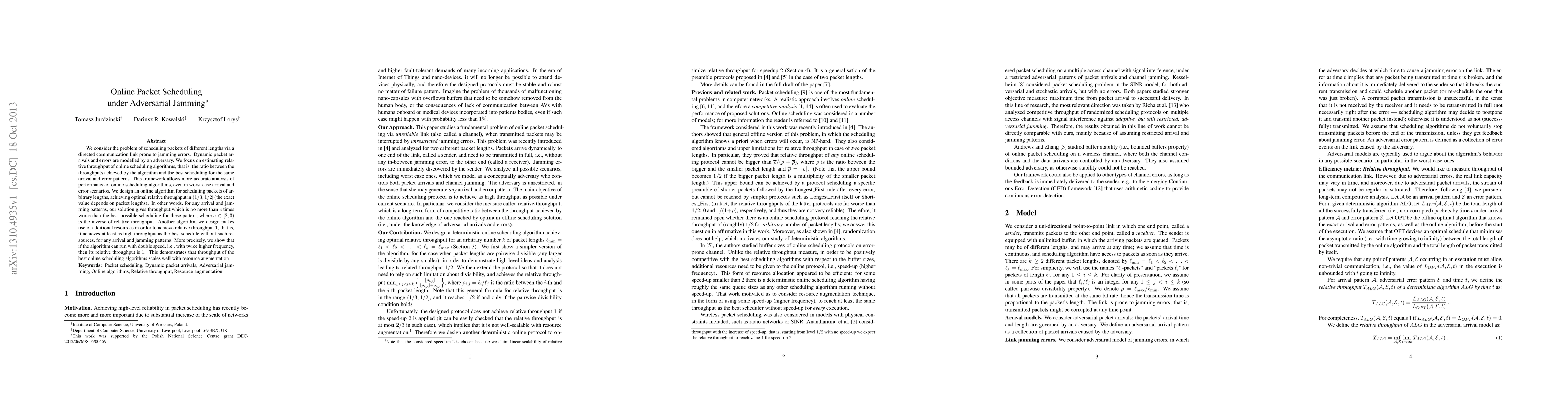The paper analyzes online packet scheduling under adversarial jamming, modeling dynamic packet arrivals and errors via an adversary. It focuses on estimating the relative throughput of online scheduling algorithms, defined as the ratio between the algorithm's throughput and the best scheduling for the same arrival and error patterns.