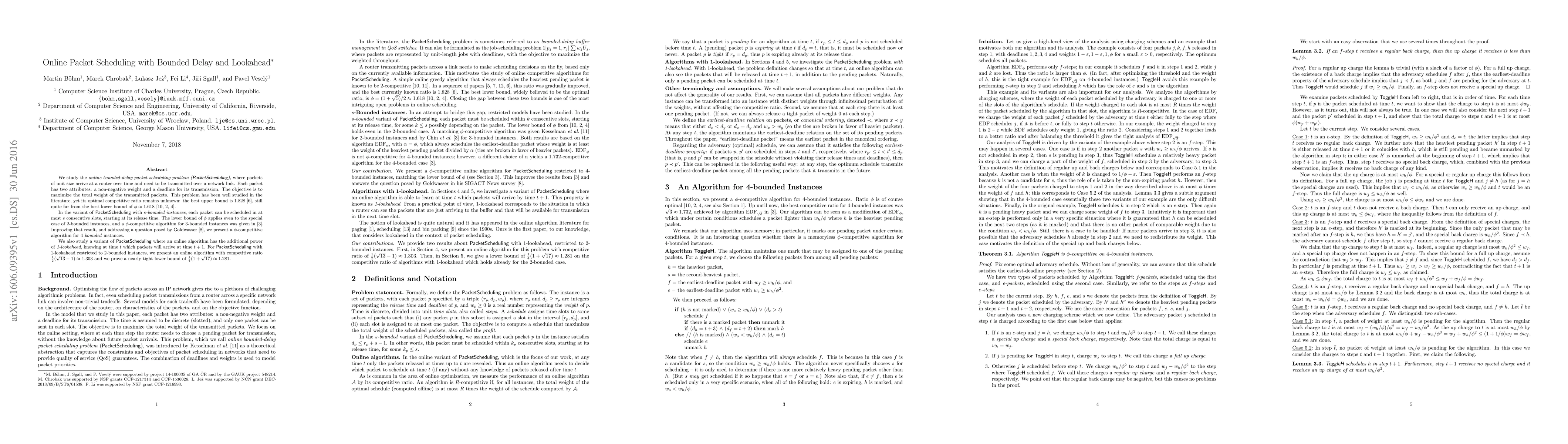 The paper introduces a novel $\phi$-competitive algorithm for 4-bounded packet scheduling instances and provides a lower bound of $(1 + \sqrt{17})/4 \approx 1.281$ for 2-bounded instances with 1-lookahead, along with an online algorithm achieving a competitive ratio of $(\sqrt{13} - 1)/2 \approx 1.303$ for specific constraints.