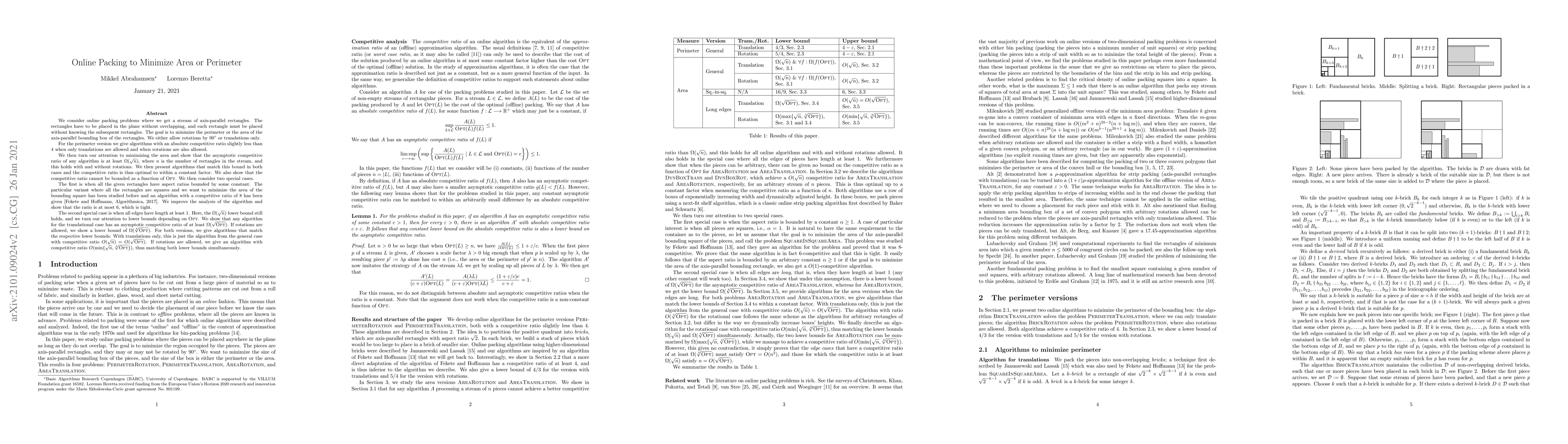 We consider online packing problems where we get a stream of axis-parallel rectangles. The rectangles have to be placed in the plane without overlapping, and each rectangle must be placed without knowing the subsequent rectangles. The goal is to minimize the perimeter or the area of the axis-parallel bounding box of the rectangles. We either allow rotations by 90 degrees or translations only. For the perimeter version we give algorithms with an absolute competitive ratio slightly less than 4 when only translations are allowed and when rotations are also allowed. We then turn our attention to minimizing the area and show that the asymptotic competitive ratio of any algorithm is at least $\Omega(\sqrt{n})$, where $n$ is the number of rectangles in the stream, and this holds with and without rotations. We then present algorithms that match this bound in both cases. We also show that the competitive ratio cannot be bounded as a function of OPT. We then consider two special cases. The first is when all the given rectangles have aspect ratios bounded by some constant. The particular variant where all the rectangles are squares and we want to minimize the area of the bounding square has been studied before and an algorithm with a competitive ratio of 8 has been given [Fekete and Hoffmann, Algorithmica, 2017]. We improve the analysis of the algorithm and show that the ratio is at most 6, which is tight. The second special case is when all edges have length at least 1. Here, the $\Omega(\sqrt n)$ lower bound still holds, and we turn our attention to lower bounds depending on OPT. We show that any algorithm has an asymptotic competitive ratio of at least $\Omega(\sqrt{OPT})$ for the translational case and $\Omega(\sqrt[4]{OPT})$ when rotations are allowed. For both versions, we give algorithms that match the respective lower bounds.