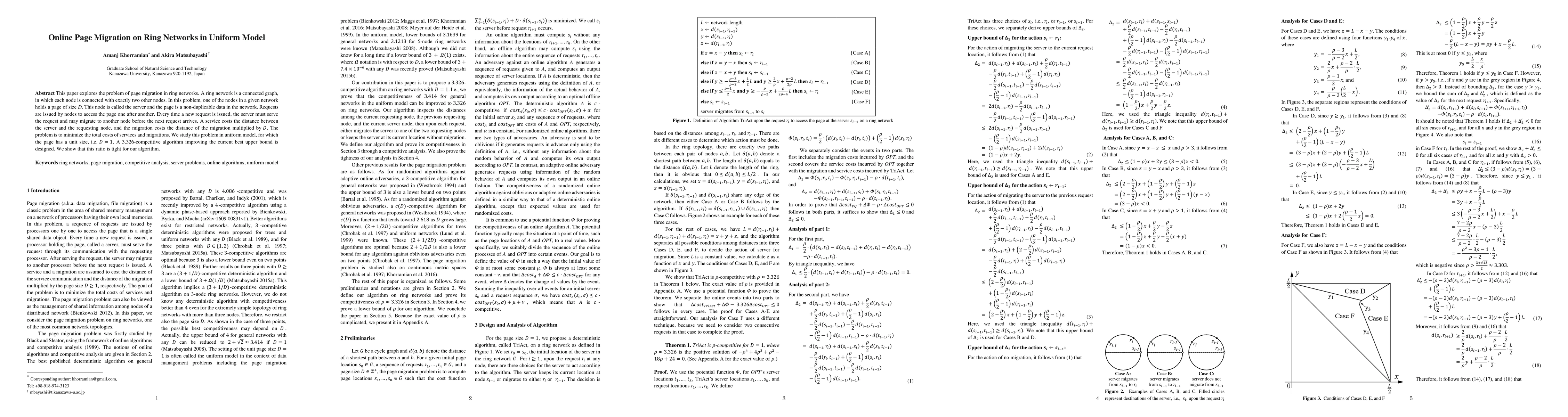 This paper explores the problem of page migration in ring networks. A ring network is a connected graph, in which each node is connected with exactly two other nodes. In this problem, one of the nodes in a given network holds a page of size D. This node is called the server and the page is a non-duplicable data in the network. Requests are issued by nodes to access the page one after another. Every time a new request is issued, the server must serve the request and may migrate to another node before the next request arrives. A service costs the distance between the server and the requesting node, and the migration costs the distance of the migration multiplied by D. The problem is to minimize the total costs of services and migrations. We study this problem in uniform model, for which the page has a unit size, i.e. D=1. A 3.326-competitive algorithm improving the current best upper bound is designed. We show that this ratio is tight for our algorithm.