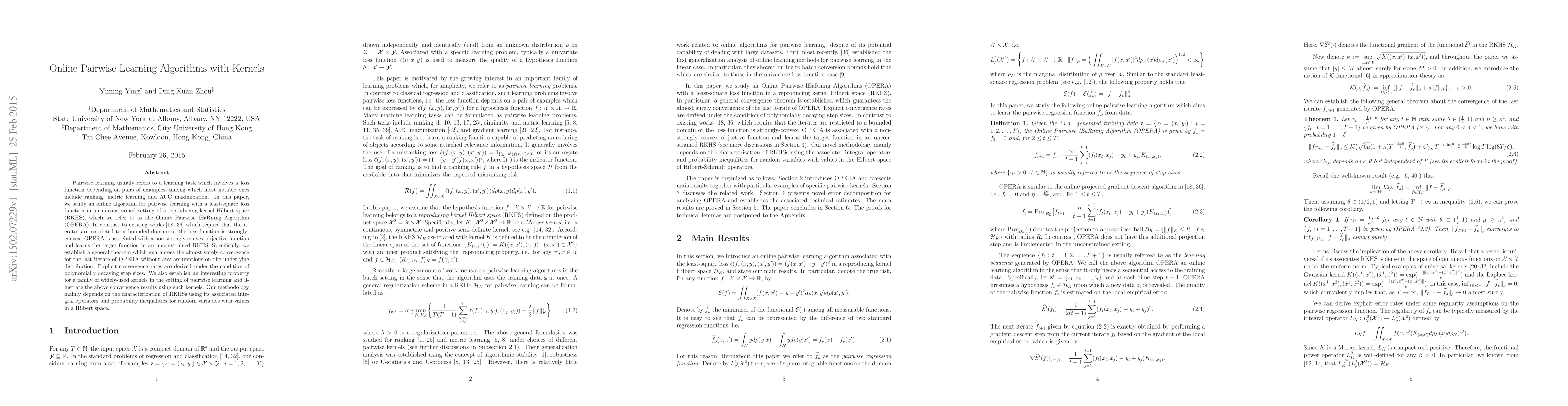 This paper introduces an online algorithm, OPERA, for pairwise learning in an unconstrained reproducing kernel Hilbert space, achieving almost sure convergence without strong convexity assumptions. It provides explicit convergence rates under polynomially decaying step sizes and demonstrates the method's effectiveness using common kernels.