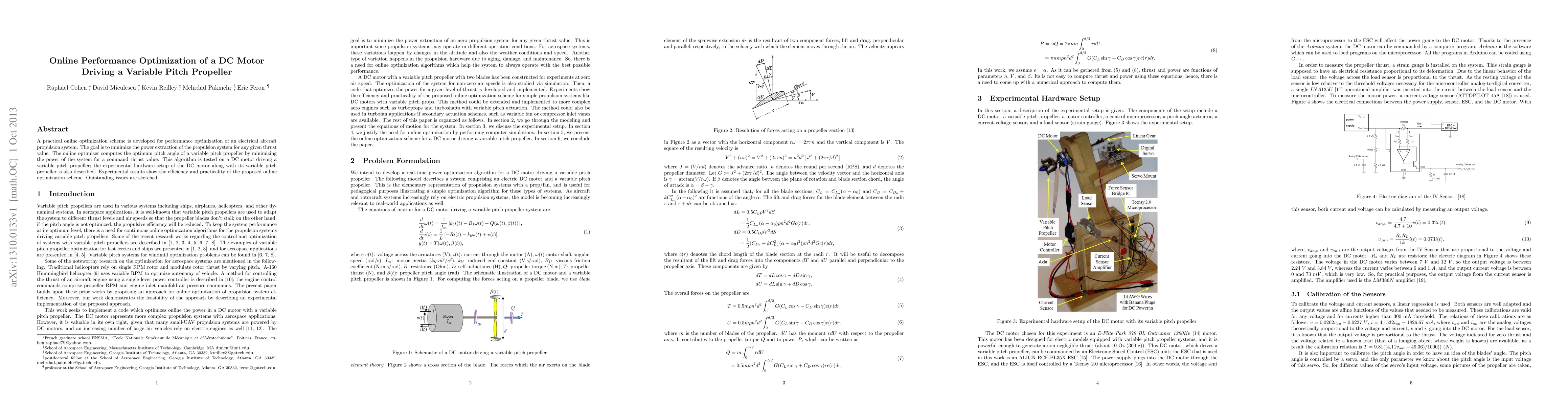 A practical online optimization scheme is developed for performance optimization of an electrical aircraft propulsion system. The goal is to minimize the power extraction of the propulsion system for any given thrust value. The online optimizer computes the optimum pitch angle of a variable pitch propeller by minimizing the power of the system for a command thrust value. This algorithm is tested on a DC motor driving a variable pitch propeller; the experimental hardware setup of the DC motor along with its variable pitch propeller is also described. Experimental results show the efficiency and practicality of the proposed online optimization scheme. Outstanding issues are sketched.
