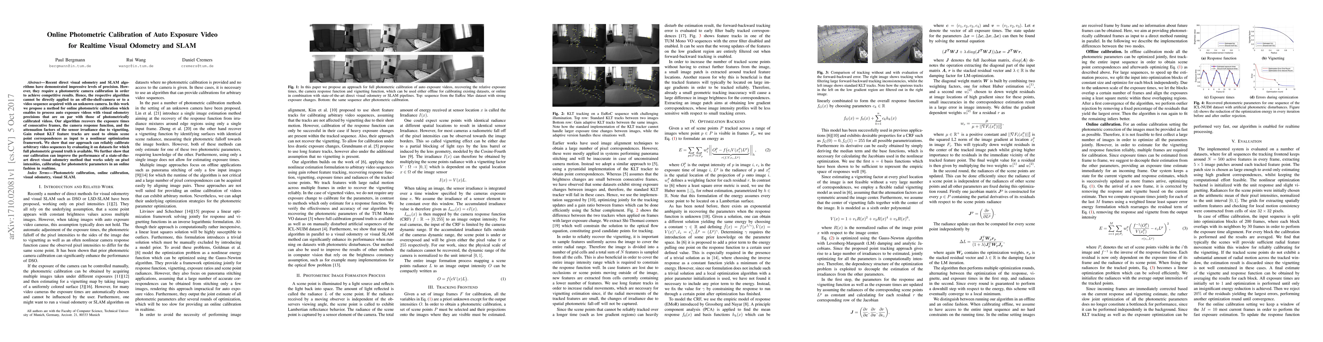 Recent direct visual odometry and SLAM algorithms have demonstrated impressive levels of precision. However, they require a photometric camera calibration in order to achieve competitive results. Hence, the respective algorithm cannot be directly applied to an off-the-shelf-camera or to a video sequence acquired with an unknown camera. In this work we propose a method for online photometric calibration which enables to process auto exposure videos with visual odometry precisions that are on par with those of photometrically calibrated videos. Our algorithm recovers the exposure times of consecutive frames, the camera response function, and the attenuation factors of the sensor irradiance due to vignetting. Gain robust KLT feature tracks are used to obtain scene point correspondences as input to a nonlinear optimization framework. We show that our approach can reliably calibrate arbitrary video sequences by evaluating it on datasets for which full photometric ground truth is available. We further show that our calibration can improve the performance of a state-of-the-art direct visual odometry method that works solely on pixel intensities, calibrating for photometric parameters in an online fashion in realtime.