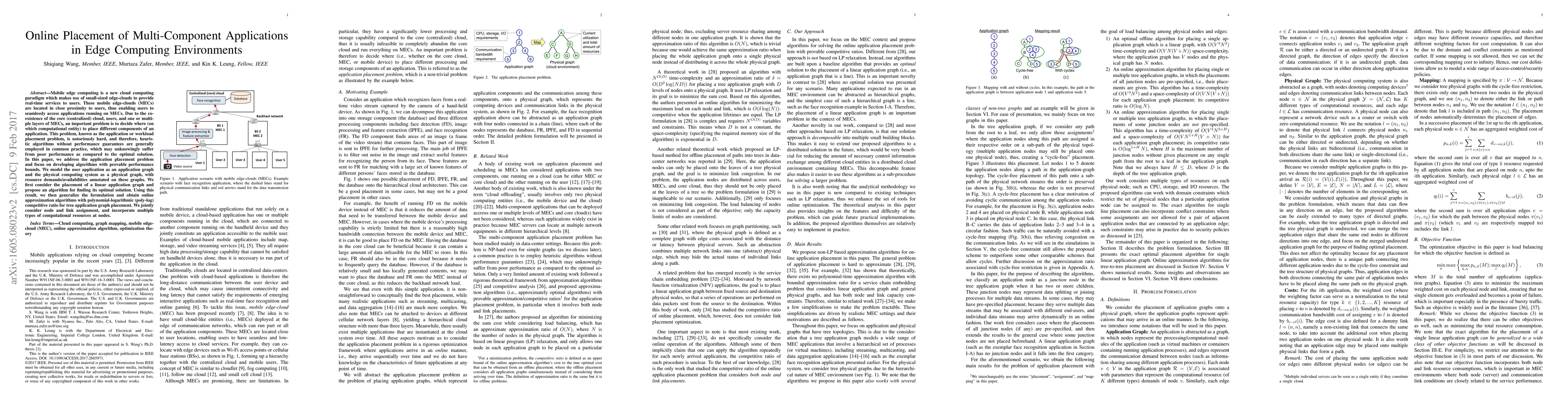 This paper addresses the application placement problem in mobile edge computing environments, proposing algorithms with provable performance bounds. It develops optimal and online approximation algorithms for placing linear and tree application graphs, considering both node and link assignments and multiple resource types.