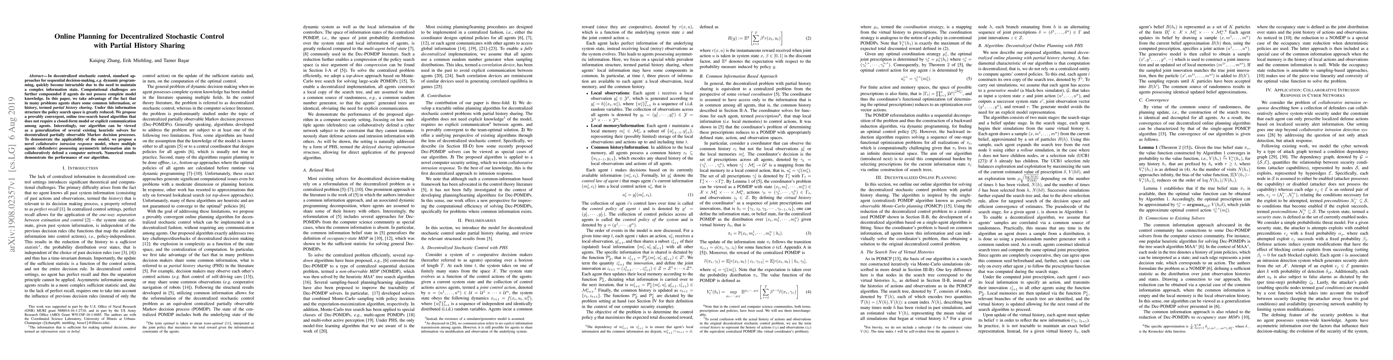 In decentralized stochastic control, standard approaches for sequential decision-making, e.g. dynamic programming, quickly become intractable due to the need to maintain a complex information state. Computational challenges are further compounded if agents do not possess complete model knowledge. In this paper, we take advantage of the fact that in many problems agents share some common information, or history, termed partial history sharing. Under this information structure the policy search space is greatly reduced. We propose a provably convergent, online tree-search based algorithm that does not require a closed-form model or explicit communication among agents. Interestingly, our algorithm can be viewed as a generalization of several existing heuristic solvers for decentralized partially observable Markov decision processes. To demonstrate the applicability of the model, we propose a novel collaborative intrusion response model, where multiple agents (defenders) possessing asymmetric information aim to collaboratively defend a computer network. Numerical results demonstrate the performance of our algorithm.