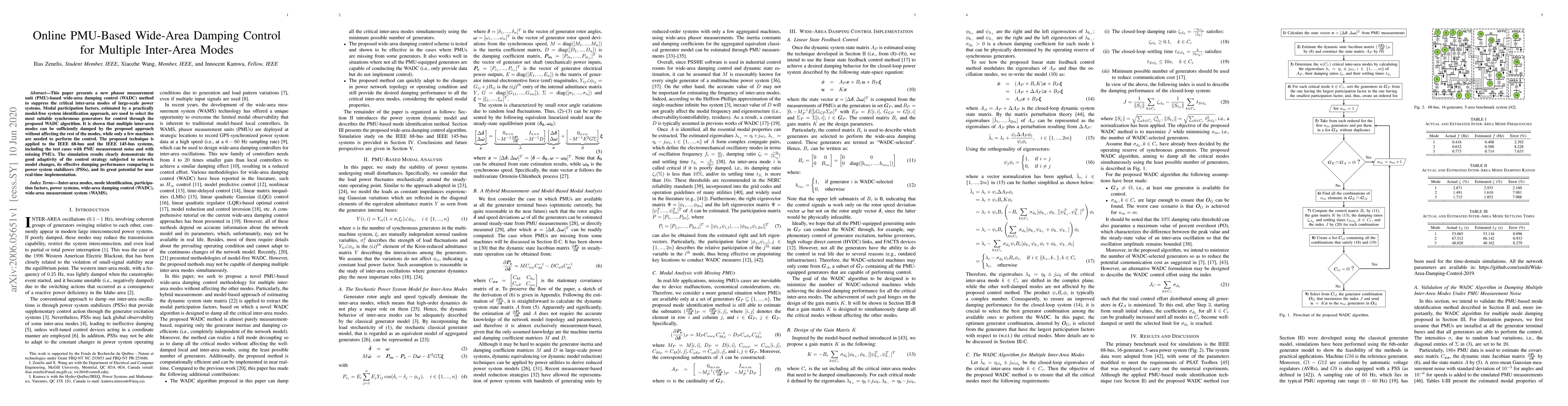 This paper introduces a PMU-based wide-area damping control method to suppress inter-area oscillations in large-scale power systems, demonstrating effective damping of multiple modes with minimal generator involvement. The proposed control strategy shows adaptability, superior performance compared to traditional stabilizers, and potential for real-time implementation.
