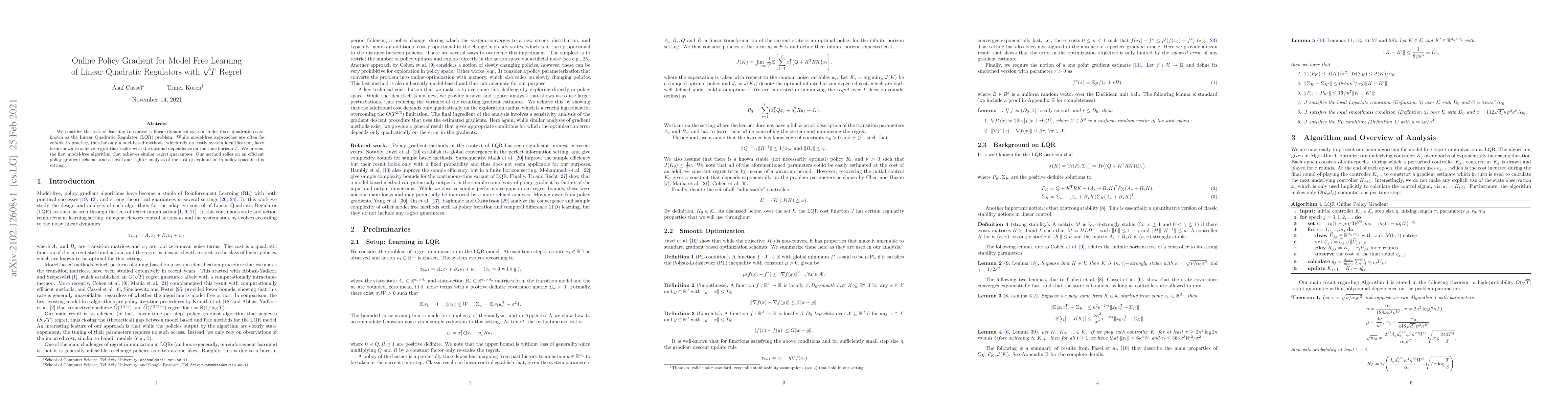 The paper presents an online policy gradient method for model-free learning of Linear Quadratic Regulators (LQR) with $\sqrt{T}$ regret, utilizing a novel analysis of exploration costs in policy space.