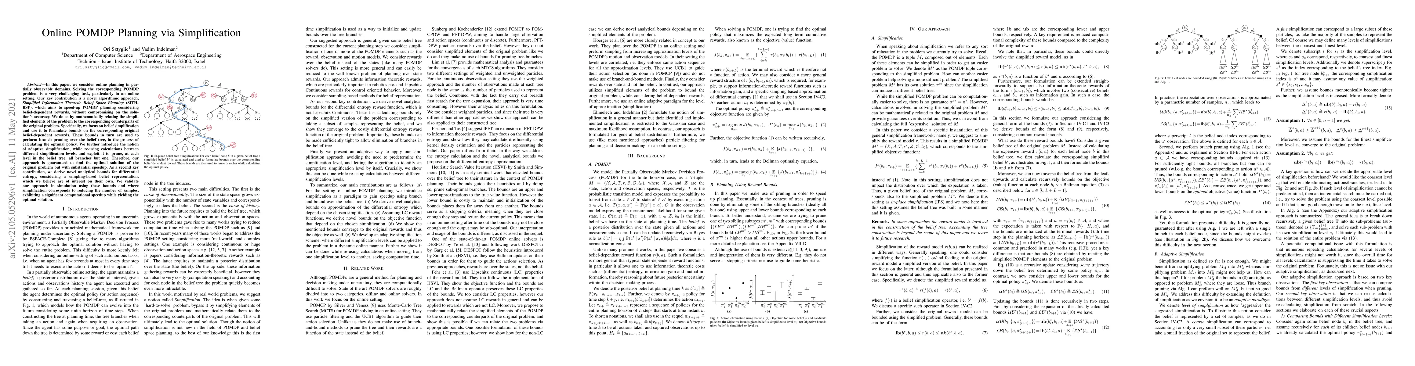 The paper introduces Simplified Information Theoretic Belief Space Planning (SITH-BSP), an algorithmic approach for online POMDP planning that simplifies elements of the problem to speed up planning without compromising accuracy. It uses belief simplification to formulate bounds on original belief-dependent rewards, enabling branch pruning in the belief tree for optimal policy calculation.