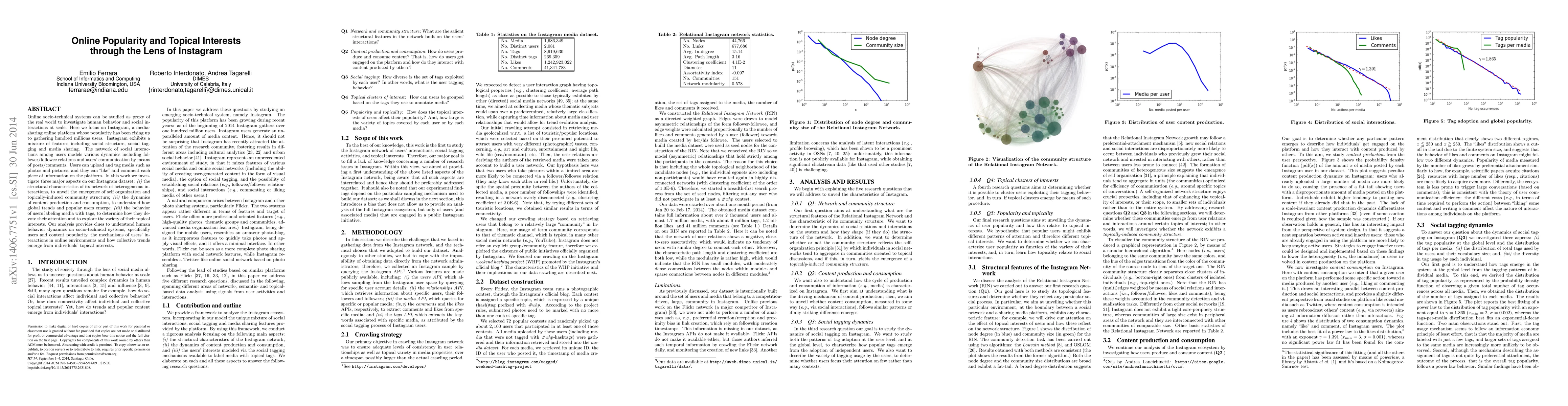 Online socio-technical systems can be studied as proxy of the real world to investigate human behavior and social interactions at scale. Here we focus on Instagram, a media-sharing online platform whose popularity has been rising up to gathering hundred millions users. Instagram exhibits a mixture of features including social structure, social tagging and media sharing. The network of social interactions among users models various dynamics including follower/followee relations and users' communication by means of posts/comments. Users can upload and tag media such as photos and pictures, and they can "like" and comment each piece of information on the platform. In this work we investigate three major aspects on our Instagram dataset: (i) the structural characteristics of its network of heterogeneous interactions, to unveil the emergence of self organization and topically-induced community structure; (ii) the dynamics of content production and consumption, to understand how global trends and popular users emerge; (iii) the behavior of users labeling media with tags, to determine how they devote their attention and to explore the variety of their topical interests. Our analysis provides clues to understand human behavior dynamics on socio-technical systems, specifically users and content popularity, the mechanisms of users' interactions in online environments and how collective trends emerge from individuals' topical interests.