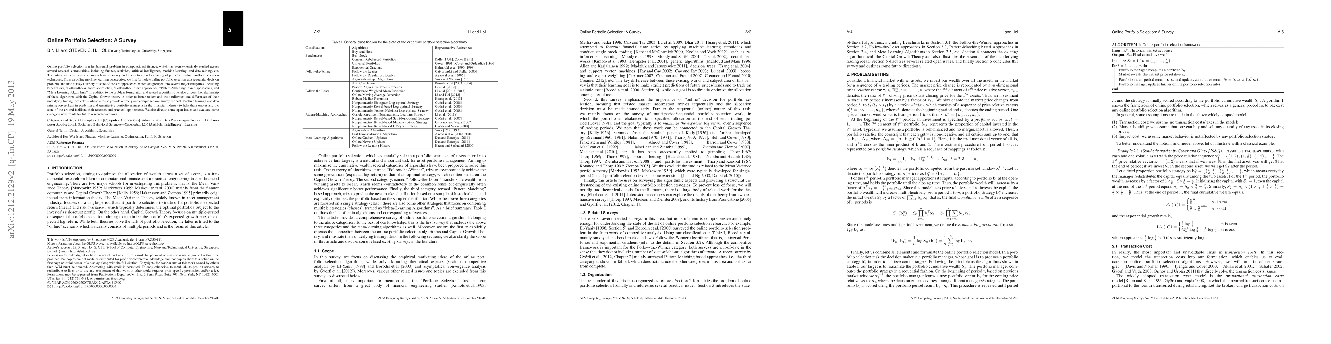 This paper provides a comprehensive survey of online portfolio selection techniques, categorizing them into benchmarks, "Follow-the-Winner" and "Follow-the-Loser" approaches, pattern-matching methods, and meta-learning algorithms, and discusses their relation to Capital Growth theory. It aims to inform both academic researchers and financial industry professionals about current methods and future research directions.