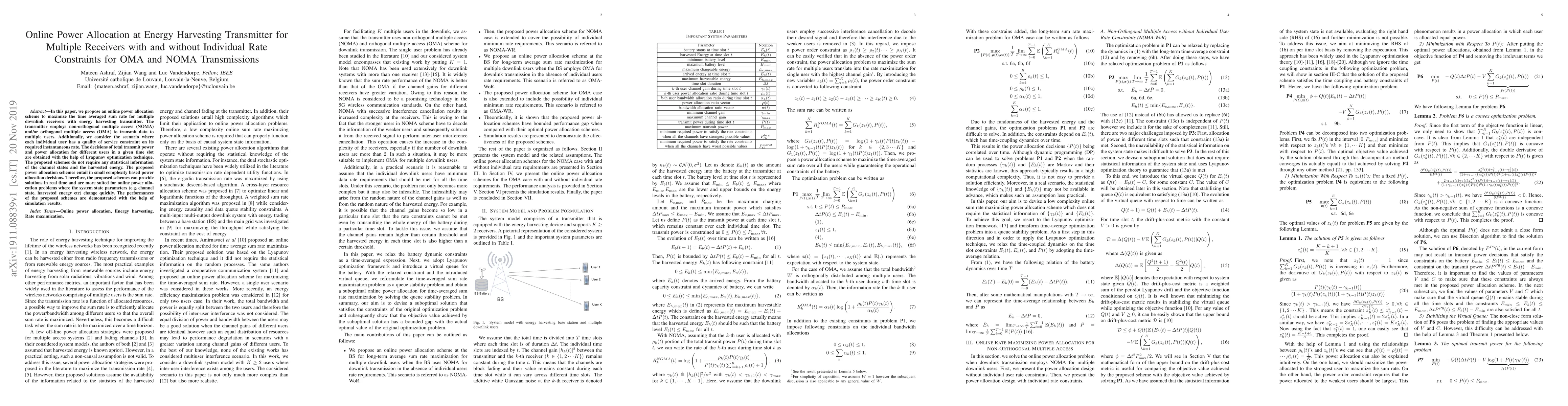 This paper proposes an online power allocation scheme using Lyapunov optimization to maximize the time-averaged sum rate for energy harvesting transmitters serving multiple receivers under individual rate constraints, employing either NOMA or OMA. The scheme operates in real time without requiring channel state or energy information.