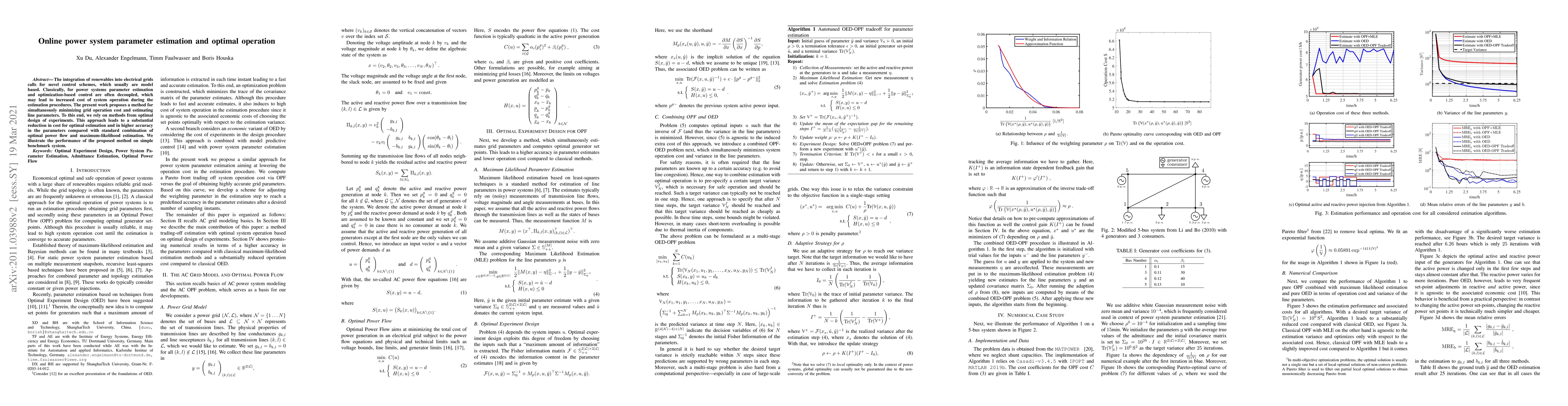 This paper proposes a method for simultaneously optimizing grid operation costs and estimating line parameters, reducing costs and improving accuracy compared to traditional methods. The approach integrates optimal design of experiments into the parameter estimation, demonstrated on a benchmark system.