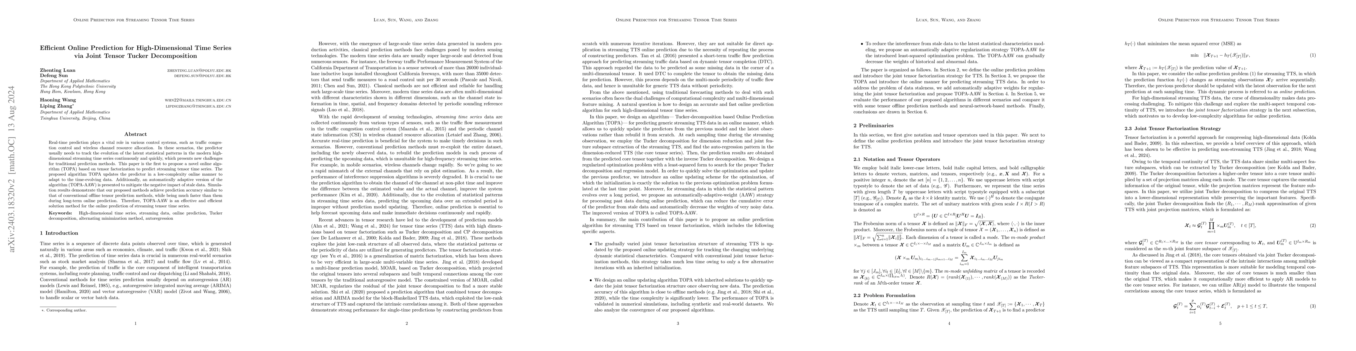 This paper introduces a novel online prediction algorithm based on tensor factorization for high-dimensional streaming time series, featuring low-complexity updates and an adaptive version to handle stale data. Simulation results show it achieves comparable accuracy to offline methods but with significantly faster performance over long-term predictions.