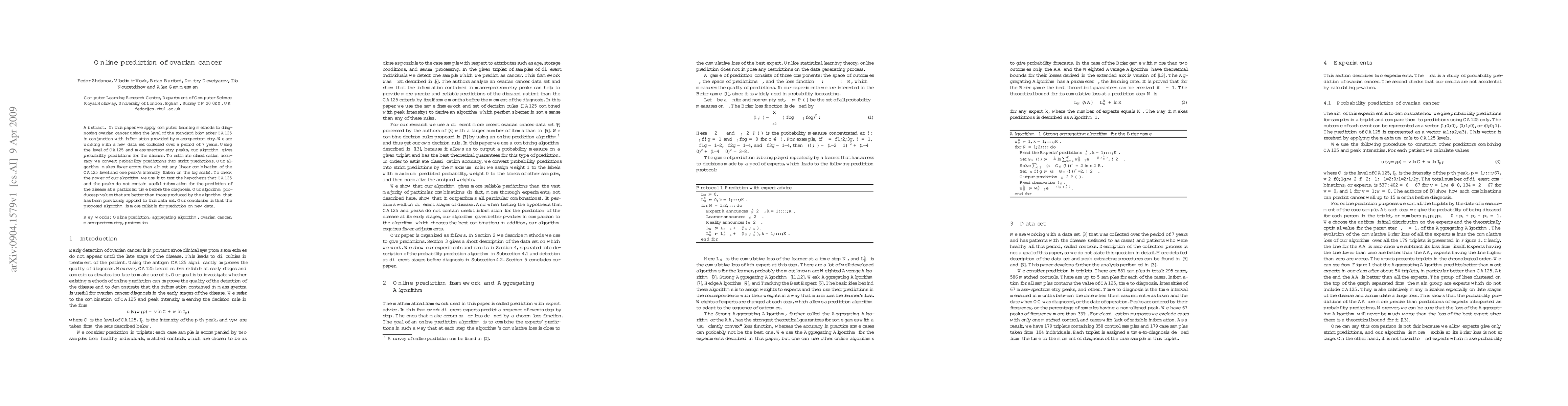 This paper proposes a computer learning algorithm to predict ovarian cancer using CA125 levels and mass-spectrometry data, achieving higher classification accuracy and better $p$-values than previous methods, indicating improved reliability for new data predictions.