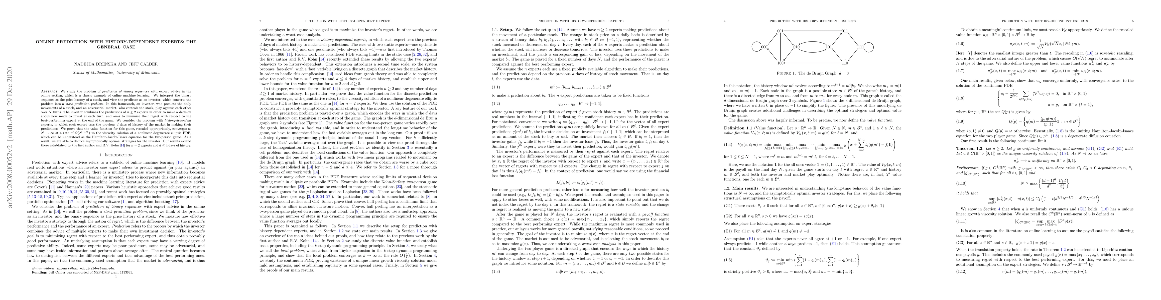 We study the problem of prediction of binary sequences with expert advice in the online setting, which is a classic example of online machine learning. We interpret the binary sequence as the price history of a stock, and view the predictor as an investor, which converts the problem into a stock prediction problem. In this framework, an investor, who predicts the daily movements of a stock, and an adversarial market, who controls the stock, play against each other over $N$ turns. The investor combines the predictions of $n\geq 2$ experts in order to make a decision about how much to invest at each turn, and aims to minimize their regret with respect to the best-performing expert at the end of the game. We consider the problem with history-dependent experts, in which each expert uses the previous $d$ days of history of the market in making their predictions. We prove that the value function for this game, rescaled appropriately, converges as $N\to \infty$ at a rate of $O(N^{-1/6})$ to the viscosity solution of a nonlinear degenerate elliptic PDE, which can be understood as the Hamilton-Jacobi-Issacs equation for the two-person game. As a result, we are able to deduce asymptotically optimal strategies for the investor. Our results extend those established by the first author and R.V.Kohn [13] for $n=2$ experts and $d\leq 4$ days of history. To appear in Communications on Pure and Applied Mathematics.