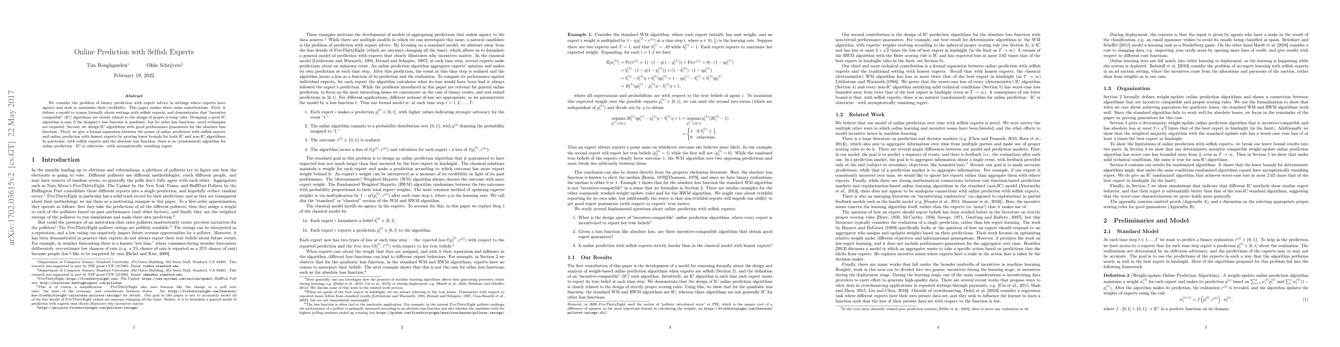 This paper introduces a model for binary prediction with selfish experts who aim to maximize their credibility, demonstrating that incentive-compatible algorithms relate to proper scoring rules. It also designs IC algorithms for absolute loss functions and proves that online prediction with selfish experts cannot achieve asymptotically vanishing regret, contrasting with honest experts.
