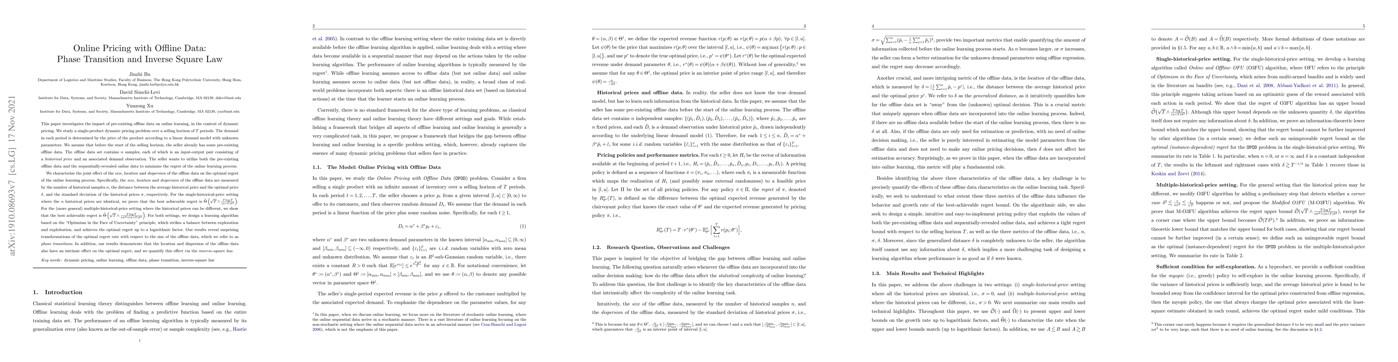 This paper investigates the impact of pre-existing offline data on online learning, in the context of dynamic pricing. We study a single-product dynamic pricing problem over a selling horizon of $T$ periods. The demand in each period is determined by the price of the product according to a linear demand model with unknown parameters. We assume that before the start of the selling horizon, the seller already has some pre-existing offline data. The offline data set contains $n$ samples, each of which is an input-output pair consisting of a historical price and an associated demand observation. The seller wants to utilize both the pre-existing offline data and the sequential online data to minimize the regret of the online learning process. We characterize the joint effect of the size, location and dispersion of the offline data on the optimal regret of the online learning process. Specifically, the size, location and dispersion of the offline data are measured by the number of historical samples $n$, the distance between the average historical price and the optimal price $\delta$, and the standard deviation of the historical prices $\sigma$, respectively. We show that the optimal regret is $\widetilde \Theta\left(\sqrt{T}\wedge \frac{T}{(n\wedge T)\delta^2+n\sigma^2}\right)$, and design a learning algorithm based on the "optimism in the face of uncertainty" principle, whose regret is optimal up to a logarithmic factor. Our results reveal surprising transformations of the optimal regret rate with respect to the size of the offline data, which we refer to as phase transitions. In addition, our results demonstrate that the location and dispersion of the offline data also have an intrinsic effect on the optimal regret, and we quantify this effect via the inverse-square law.