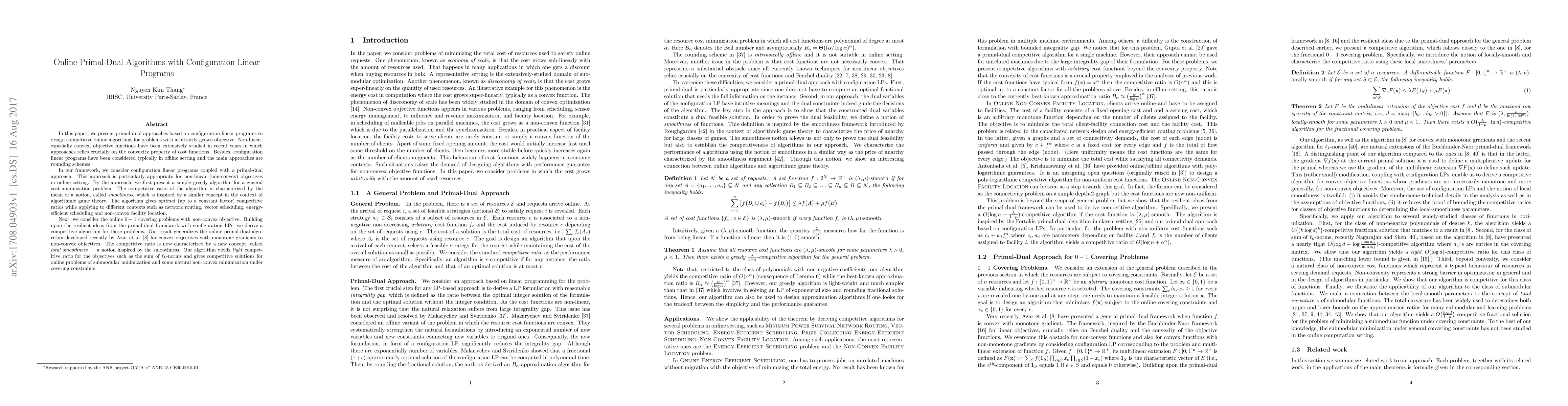 This paper introduces primal-dual algorithms based on configuration linear programs for designing competitive online algorithms for non-convex objective functions. It presents a greedy algorithm with optimal competitive ratios for various applications and extends the online primal-dual method to handle non-convex objectives in $0-1$ covering problems, introducing a new concept of local smoothness.
