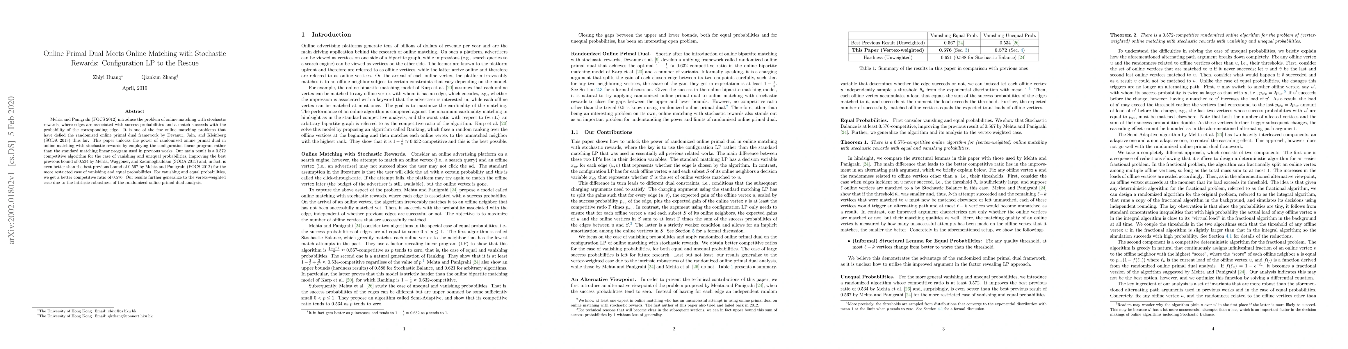 This paper improves the competitive algorithm for online matching with stochastic rewards by using the configuration linear program instead of the standard matching linear program. The authors achieve a competitive ratio of 0.572 for vanishing and unequal probabilities, surpassing previous bounds.