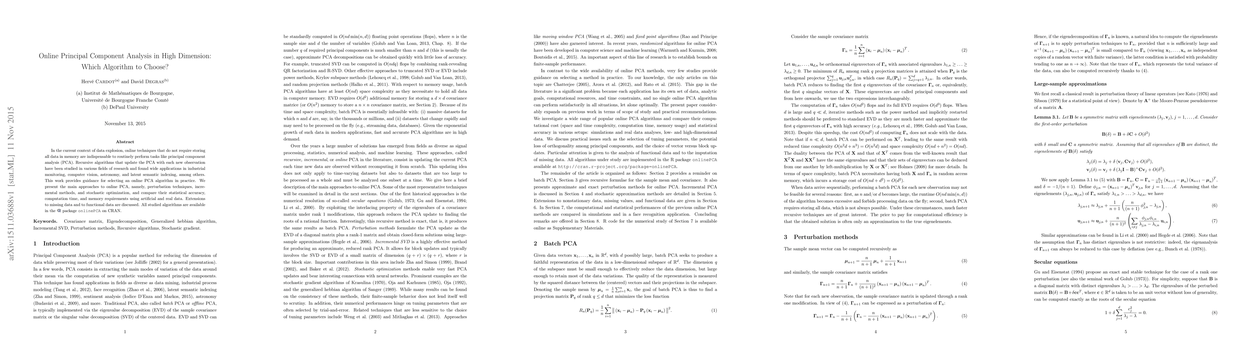 This paper evaluates various online PCA algorithms, including perturbation techniques, incremental methods, and stochastic optimization, comparing their statistical accuracy, computation time, and memory usage. It provides practical guidance for selecting the most suitable algorithm for high-dimensional data analysis, with extensions to handle missing and functional data.