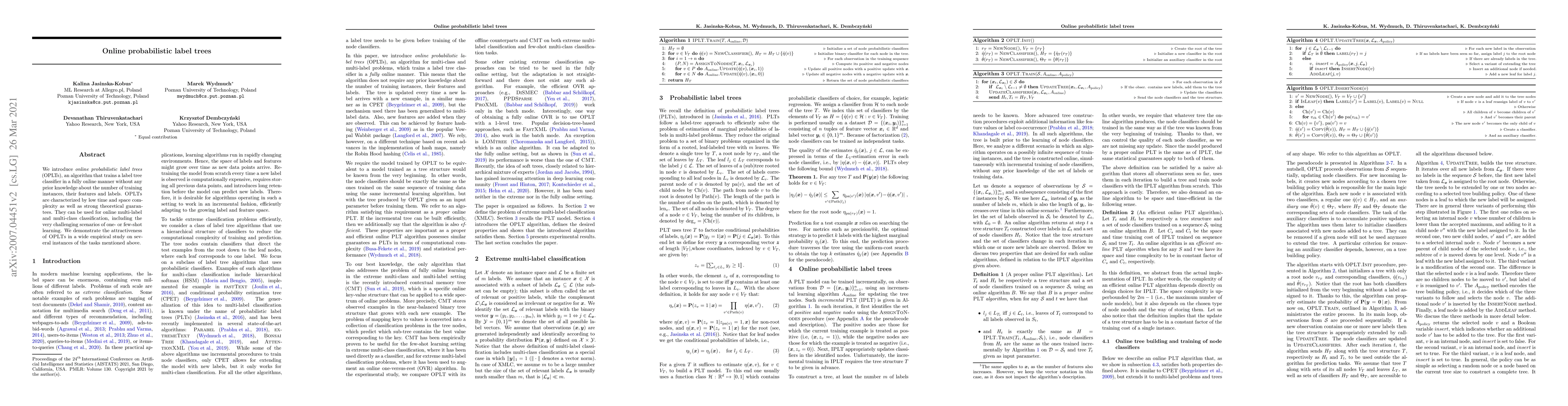 This research introduces online probabilistic label trees (OPLTs), an algorithm for fully online training without prior knowledge of instances, features, or labels. OPLTs offer strong theoretical guarantees, low complexity, and can be applied to multi-label and multi-class classification tasks.