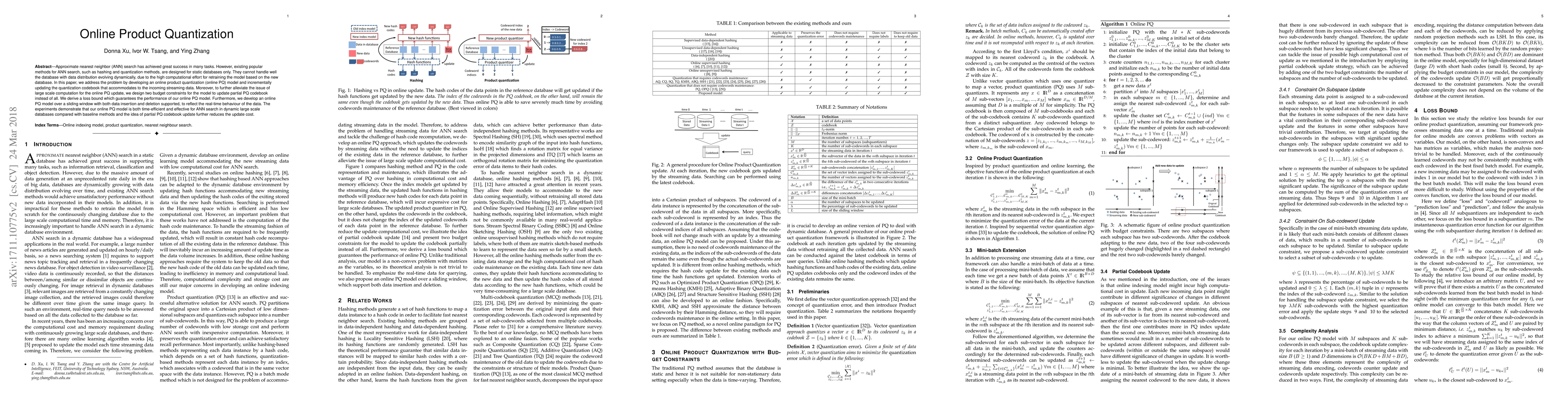 This paper introduces an online product quantization (online PQ) model for efficient approximate nearest neighbor search in dynamic databases, enabling incremental updates to the quantization codebook with partial updates to reduce computational costs. Experimental results show the model's effectiveness and time efficiency compared to static methods.