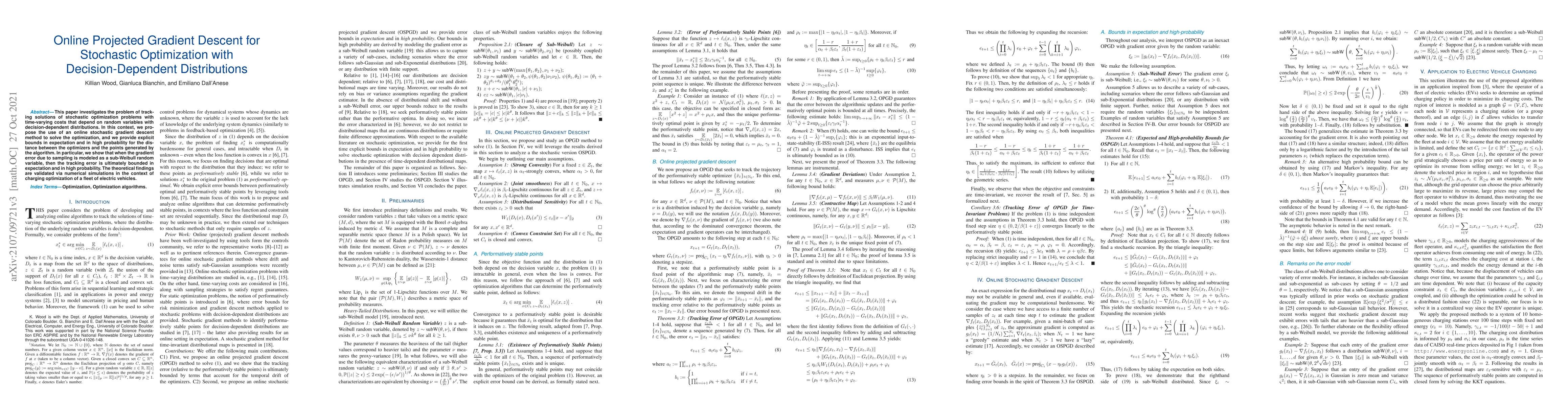 This paper proposes an online projected gradient descent method for stochastic optimization with decision-dependent distributions, providing bounds for tracking error and validating the approach through simulations for electric vehicle charging optimization. Theoretical results show bounded tracking error in expectation and high probability when gradient error is modeled as a sub-Weibull random variable.