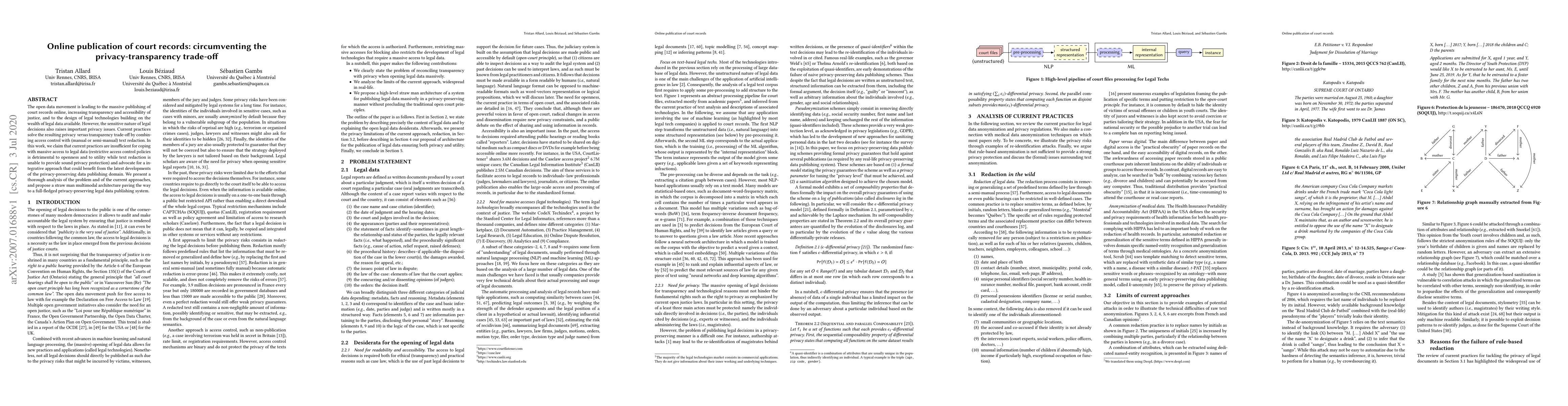 The open data movement is leading to the massive publishing of court records online, increasing transparency and accessibility of justice, and to the design of legal technologies building on the wealth of legal data available. However, the sensitive nature of legal decisions also raises important privacy issues. Current practices solve the resulting privacy versus transparency trade-off by combining access control with (manual or semi-manual) text redaction. In this work, we claim that current practices are insufficient for coping with massive access to legal data (restrictive access control policies is detrimental to openness and to utility while text redaction is unable to provide sound privacy protection) and advocate for a in-tegrative approach that could benefit from the latest developments of the privacy-preserving data publishing domain. We present a thorough analysis of the problem and of the current approaches, and propose a straw man multimodal architecture paving the way to a full-fledged privacy-preserving legal data publishing system.