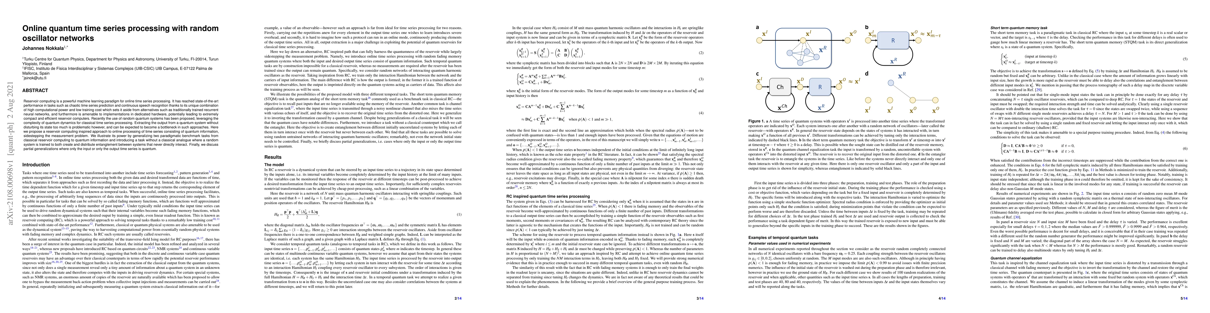 This paper proposes a novel reservoir computing approach for online quantum time series processing using random oscillator networks, addressing the measurement problem in quantum systems. It demonstrates the method's effectiveness by tackling quantum information tasks and discussing scenarios where only input or output time series are quantum.