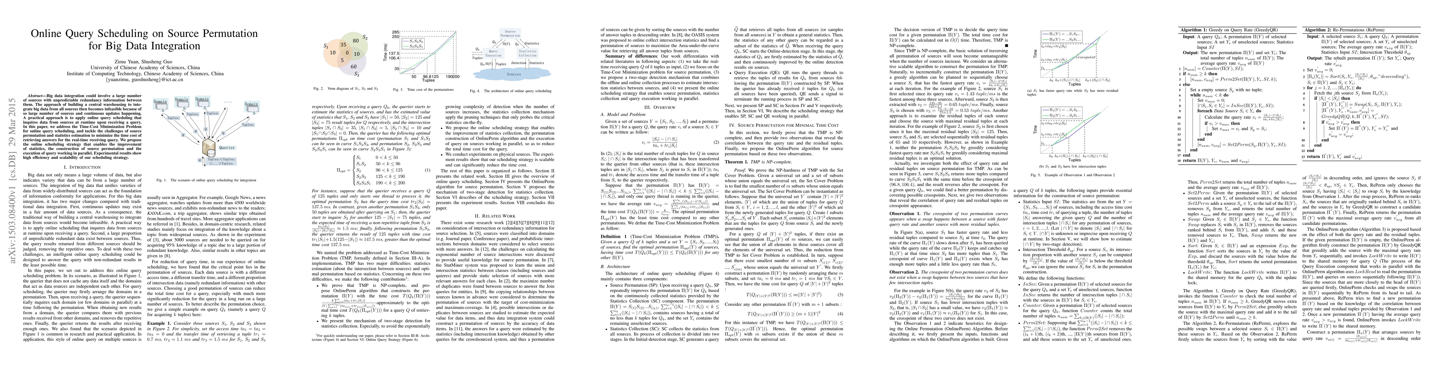 Big data integration could involve a large number of sources with unpredictable redundancy information between them. The approach of building a central warehousing to integrate big data from all sources then becomes infeasible because of so large number of sources and continuous updates happening. A practical approach is to apply online query scheduling that inquires data from sources at runtime upon receiving a query. In this paper, we address the Time-Cost Minimization Problem for online query scheduling, and tackle the challenges of source permutation and statistics estimation to minimize the time cost of retrieving answers for the real-time receiving query. We propose the online scheduling strategy that enables the improvement of statistics, the construction of source permutation and the execution of query working in parallel. Experimental results show high efficiency and scalability of our scheduling strategy.