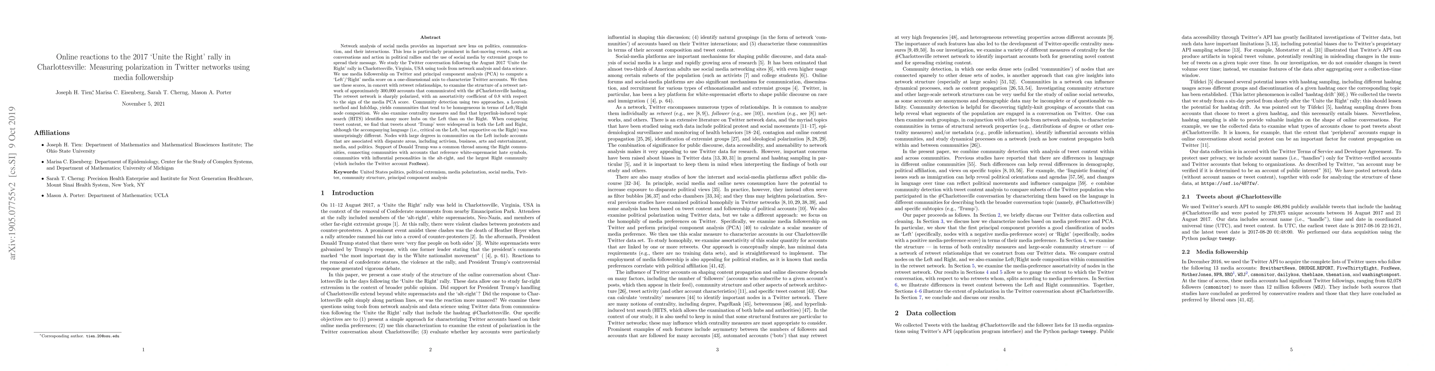 This study examines Twitter reactions to the 2017 Charlottesville rally using network analysis and media followership, revealing a sharply polarized retweet network with high assortativity. Communities detected show strong Left/Right homogeneity, with Trump support uniting Right-leaning groups.