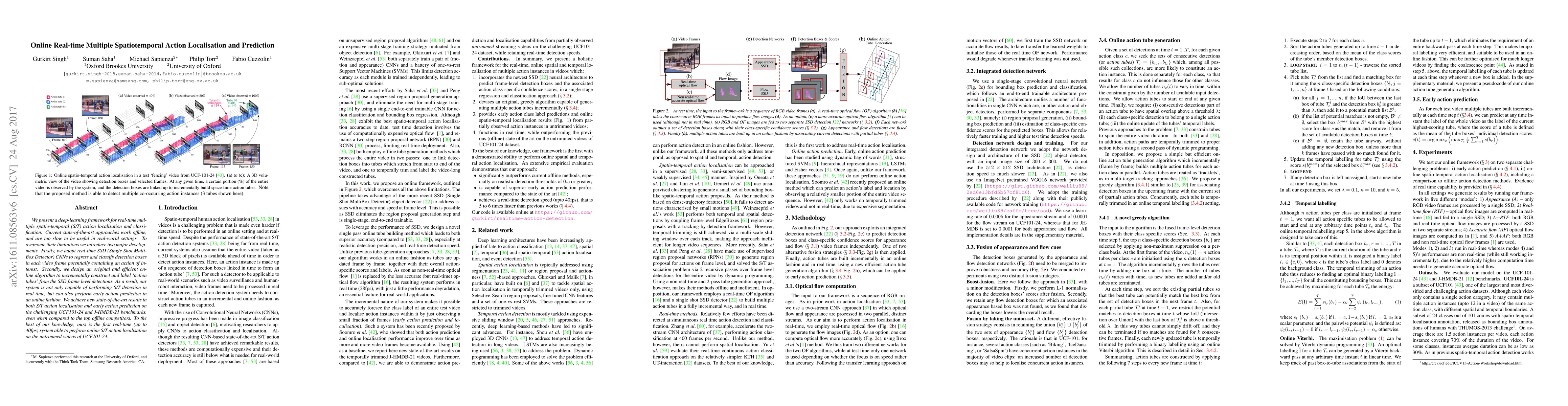 This paper introduces a real-time deep-learning framework for multiple spatio-temporal action localisation and early prediction using real-time SSD and an efficient online algorithm for constructing action tubes. The system achieves state-of-the-art results on UCF101-24 and J-HMDB-21 benchmarks, outperforming offline competitors.
