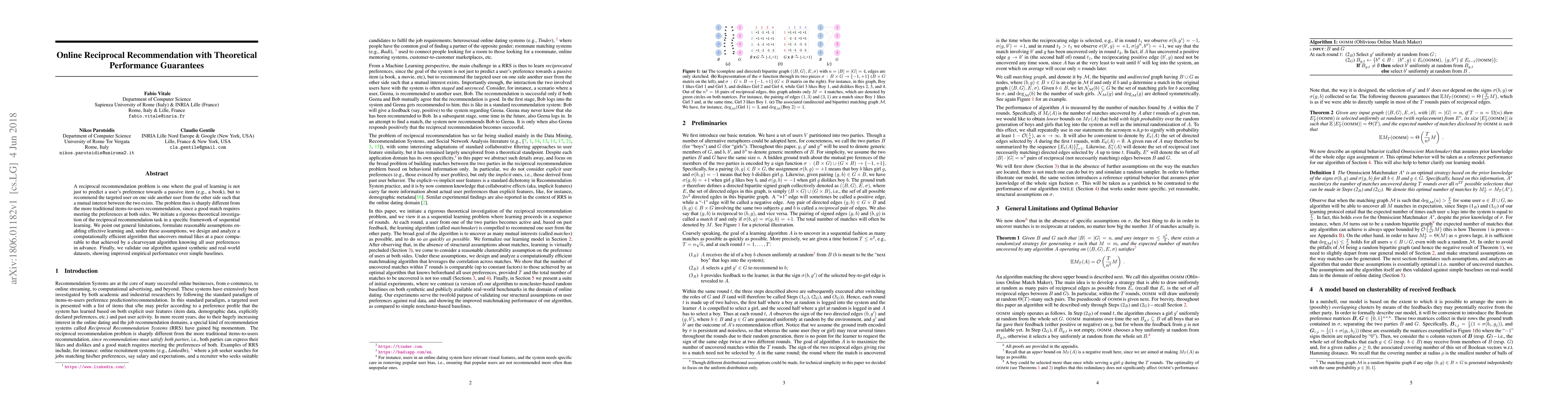 This paper investigates the reciprocal recommendation problem, where the goal is to find mutual interests between users rather than just recommending items to users. The authors propose a theoretical framework, formulate assumptions, and develop an efficient algorithm that performs comparably to a perfect algorithm, validated through synthetic and real-world datasets.