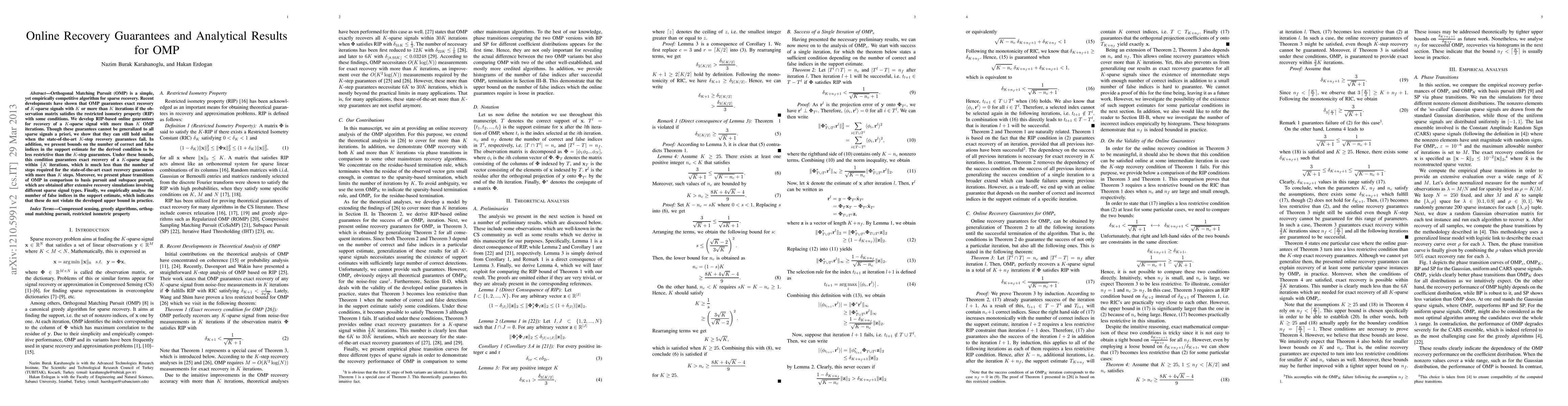 This paper develops online recovery guarantees for Orthogonal Matching Pursuit (OMP) under the restricted isometry property (RIP), showing exact recovery of K-sparse signals within 3K/2 iterations, significantly fewer than traditional guarantees. It also compares OMP's performance with basis pursuit and subspace pursuit through simulations and empirical analysis.