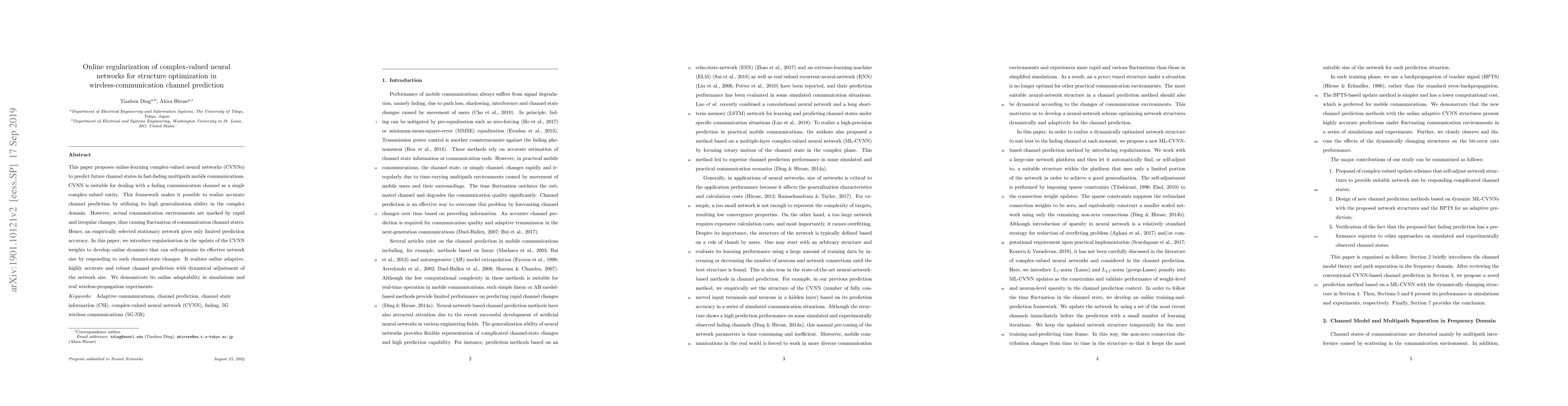 This paper introduces online-learning complex-valued neural networks (CVNNs) for predicting channel states in fast-fading wireless communications, employing regularization to dynamically adjust the network size for optimal adaptation to rapidly changing environments. The proposed method achieves highly accurate and robust channel predictions through online self-optimization.
