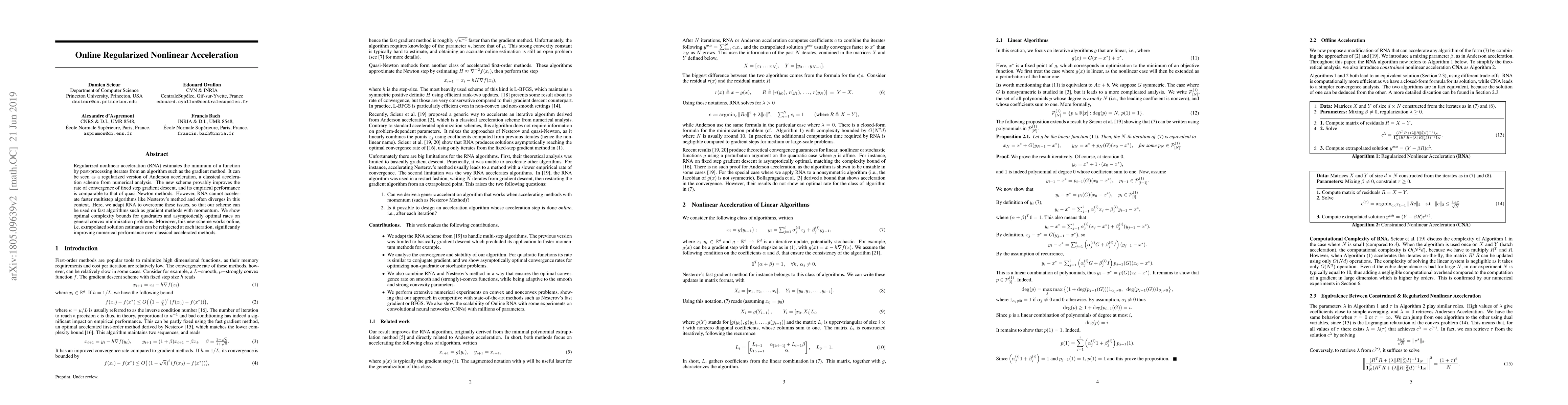 This paper introduces an online regularized nonlinear acceleration (RNA) scheme that enhances the convergence rate of gradient descent methods, particularly for fast algorithms like Nesterov's method. The adapted RNA method provides optimal complexity bounds for quadratic functions and asymptotically optimal rates for general convex minimization problems, while maintaining the online capability for improved numerical performance.