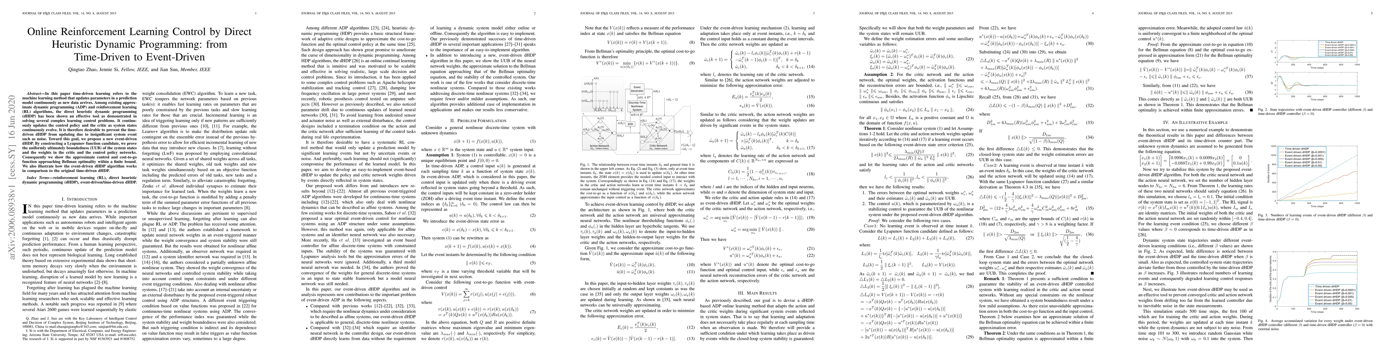 This paper proposes an event-driven version of direct heuristic dynamic programming (dHDP) to improve online reinforcement learning control, contrasting it with the time-driven approach. It demonstrates the uniformly ultimately boundedness of system states and weights, showing the method approaches Bellman optimality within a finite bound.