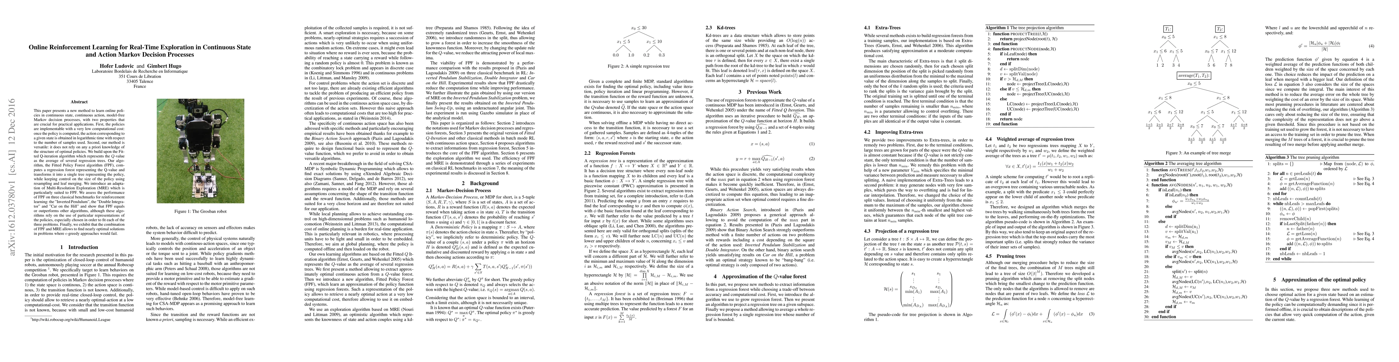 This paper presents a new method to learn online policies in continuous state, continuous action, model-free Markov decision processes, with two properties that are crucial for practical applications. First, the policies are implementable with a very low computational cost: once the policy is computed, the action corresponding to a given state is obtained in logarithmic time with respect to the number of samples used. Second, our method is versatile: it does not rely on any a priori knowledge of the structure of optimal policies. We build upon the Fitted Q-iteration algorithm which represents the $Q$-value as the average of several regression trees. Our algorithm, the Fitted Policy Forest algorithm (FPF), computes a regression forest representing the Q-value and transforms it into a single tree representing the policy, while keeping control on the size of the policy using resampling and leaf merging. We introduce an adaptation of Multi-Resolution Exploration (MRE) which is particularly suited to FPF. We assess the performance of FPF on three classical benchmarks for reinforcement learning: the "Inverted Pendulum", the "Double Integrator" and "Car on the Hill" and show that FPF equals or outperforms other algorithms, although these algorithms rely on the use of particular representations of the policies, especially chosen in order to fit each of the three problems. Finally, we exhibit that the combination of FPF and MRE allows to find nearly optimal solutions in problems where $\epsilon$-greedy approaches would fail.