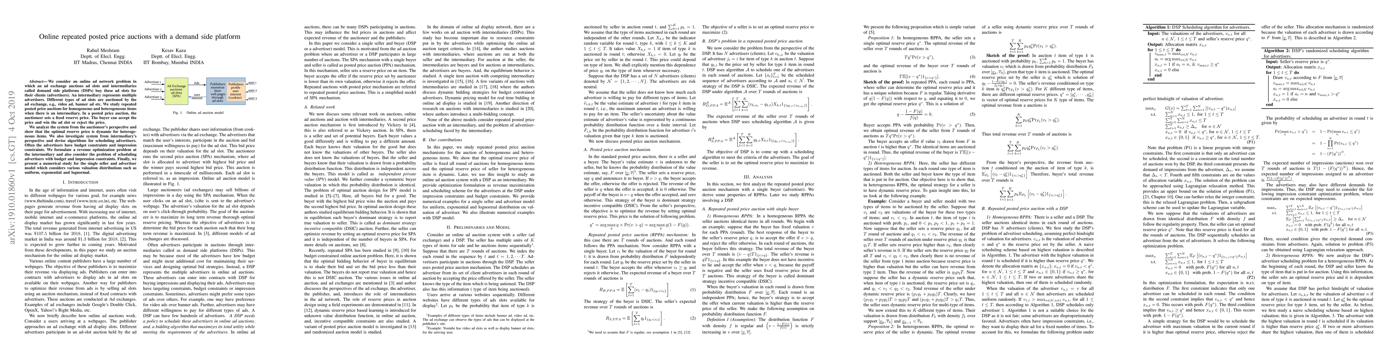 We consider an online ad network problem in which an ad exchange auctions ad slots and intermediaries called demand side platforms (DSPs) buy these ad slots for their clients (advertisers). An intermediary represents multiple advertisers. Different types of ad slots are auctioned by the ad exchange, e.g., video ad, banner ad etc. We study repeated posted price auctions for homogeneous and heterogeneous items when there is an intermediary. In a posted price auction, the auctioneer sets a fixed reserve price. The buyer can accept the price and win the ad slot or reject the price. We analyze the system from the auctioneer's perspective and show that the optimal reserve price is dynamic for heterogeneous items. We also investigate system from intermediary's perspective and devise algorithms for scheduling advertisers. Often the advertisers have budget constraints and impression constraints. We formulate a revenue optimization problem at the intermediary and also consider the problem of scheduling advertisers with budget and impression constraints. Finally, we present a numerical study for the single seller and advertiser model which considers various valuation distributions such as uniform, exponential and lognormal.