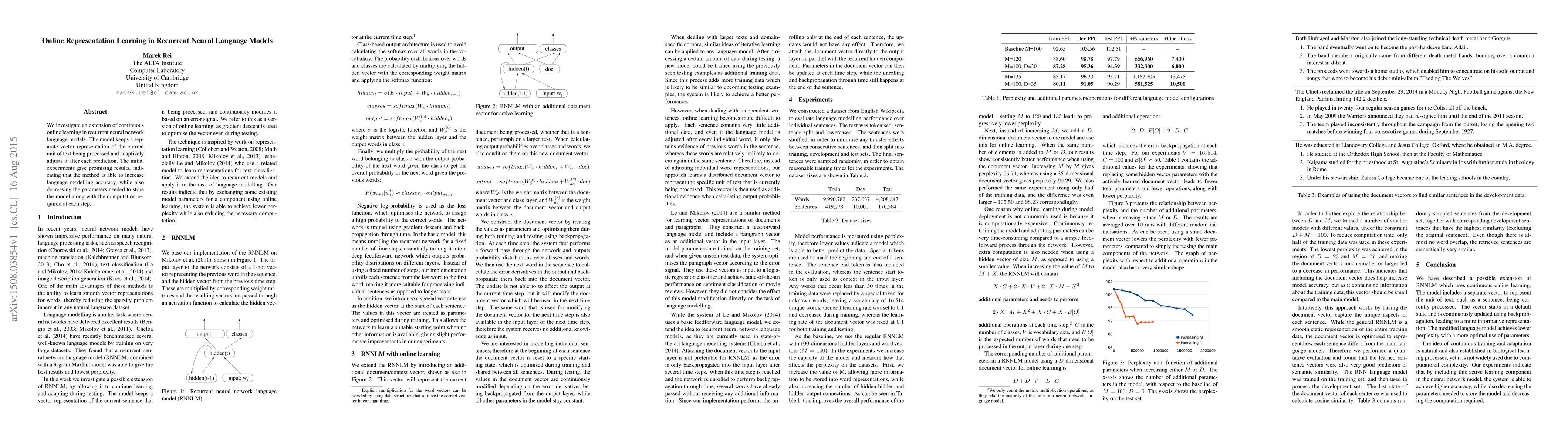 This paper explores continuous online learning in recurrent neural network language models, where the model dynamically updates its text representation after each prediction, leading to improved accuracy and reduced model parameters and computational cost. Initial results are promising.